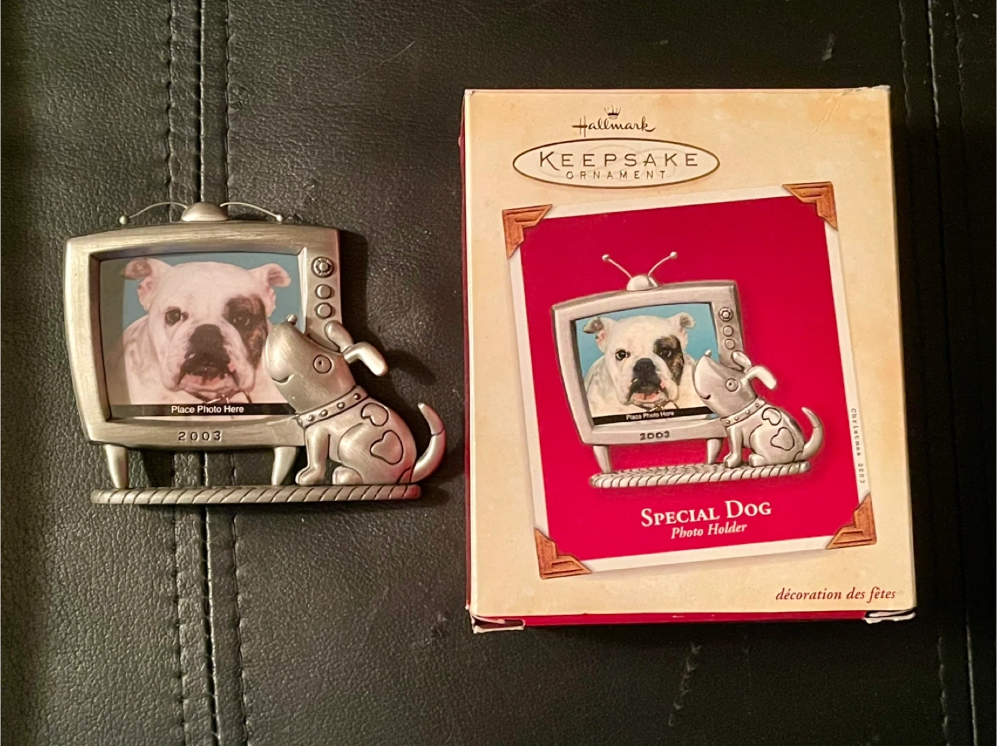 Hallmark Keepsake Ornament, Special Dog Photo Holder. The metal ornament features a dog sitting next to a TV. It's from 2003 and appears to be pewter. Can be used freestanding or as a Christmas tree ornament. The box is included!