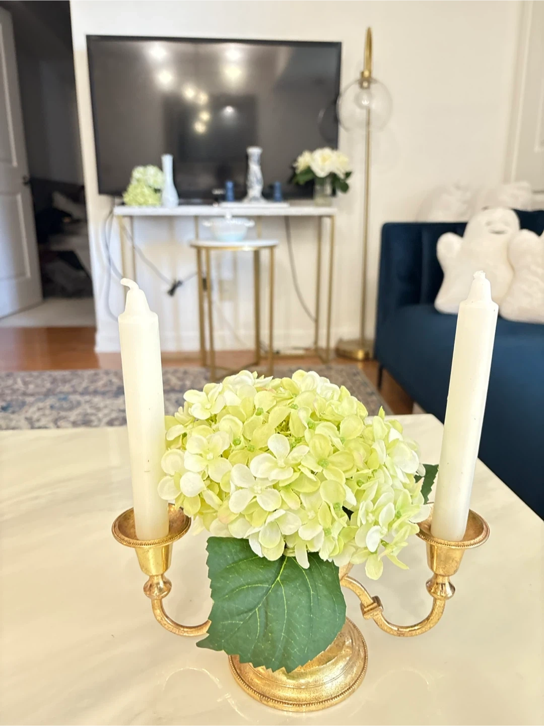 Selling a gold-coloured candlestick holder. It's in good condition and would look lovely on a dining table or mantelpiece. It can hold two candles and a small floral arrangement in the centre!