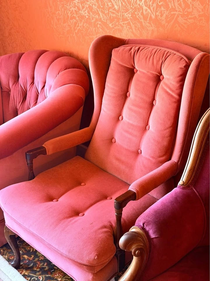 Vintage wingback armchair upholstered in soft pink tufted velvet for a classic, cozy look. Its curved backrest and carved wooden legs add traditional charm perfect for living rooms or reading nooks.