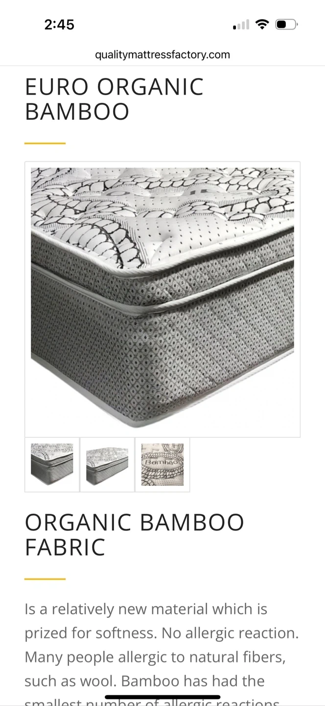 This is a Euro Organic Bamboo mattress. The fabric is organic bamboo, which is prized for its softness and is hypoallergenic