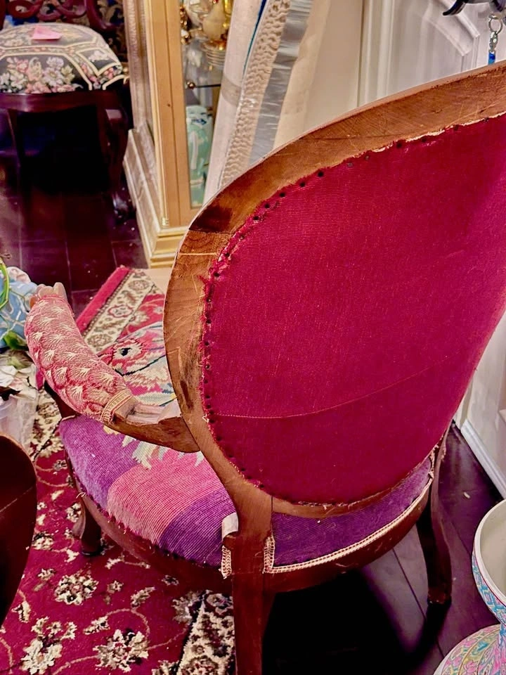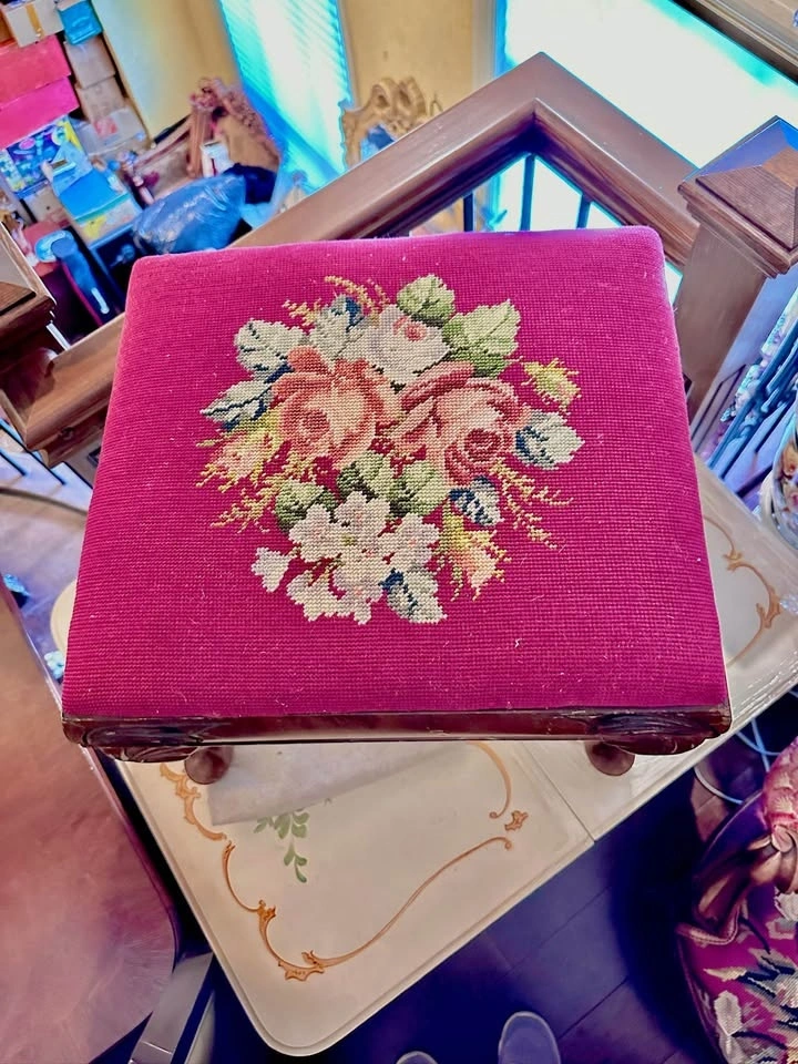 $280 for the set. Will consider separate offers. Lovely matching vintage armchair and footstool featuring hand-stitched floral needlepoint upholstery. Both pieces have a rich raspberry-pink fabric with beautiful flower designs. The armchair has a carved wooden frame and padded armrests with a classic antique look. The footstool has round wooden feet and complements the chair perfectly.