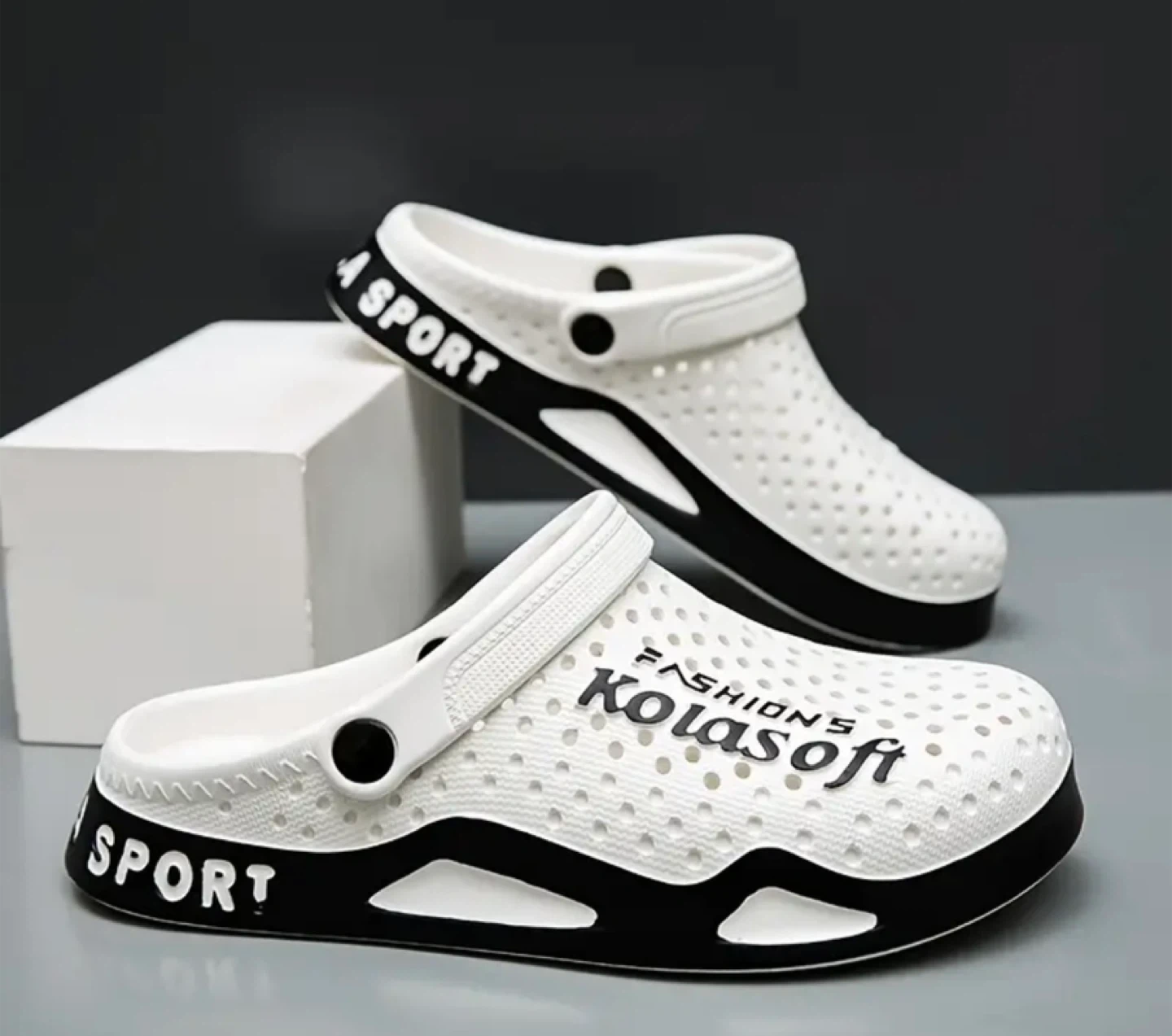 Get ready for summer with these stylish Kolasoft clogs! They're white with black accents and a sporty design. Perfect for casual wear or a day at the beach