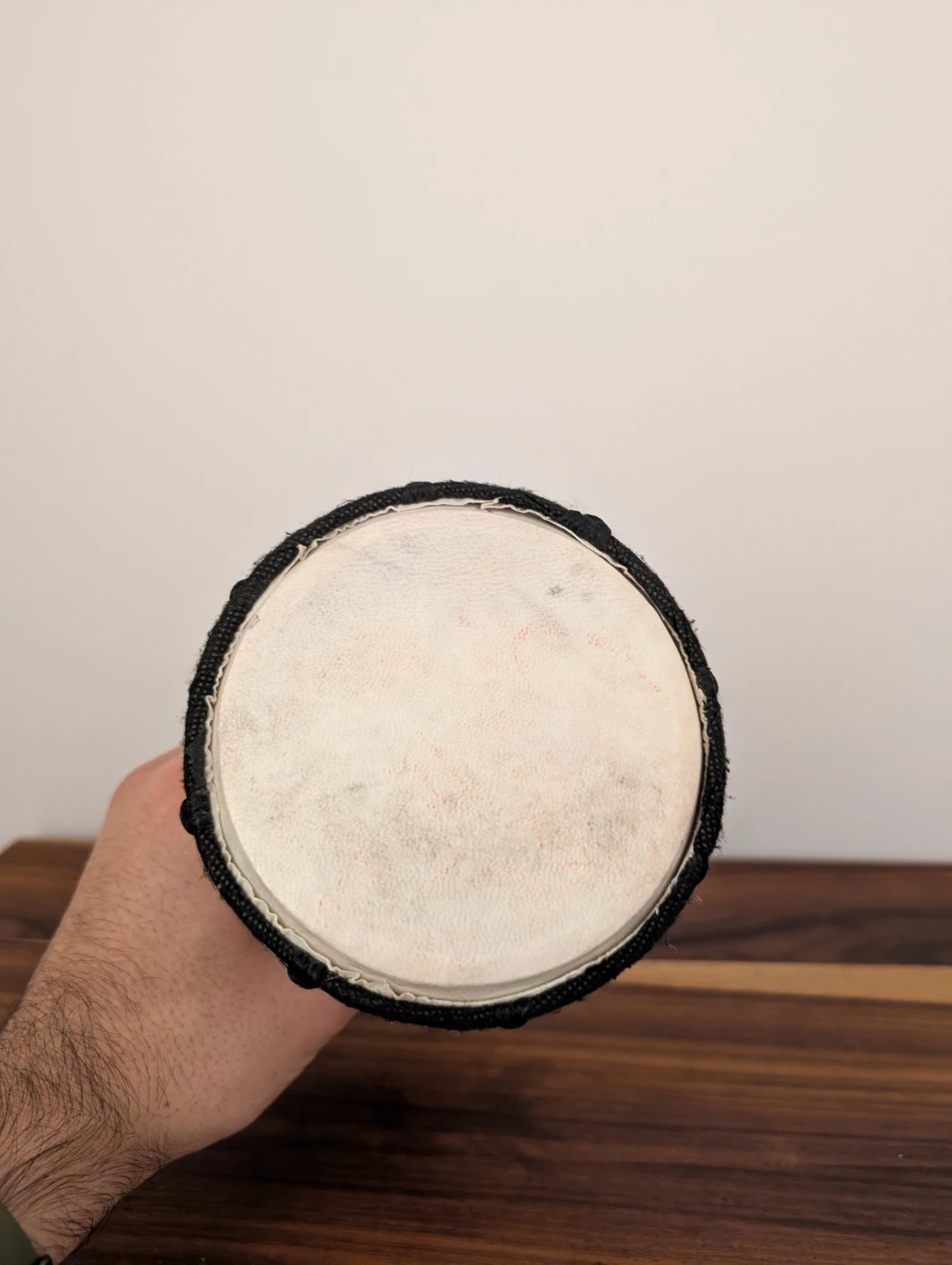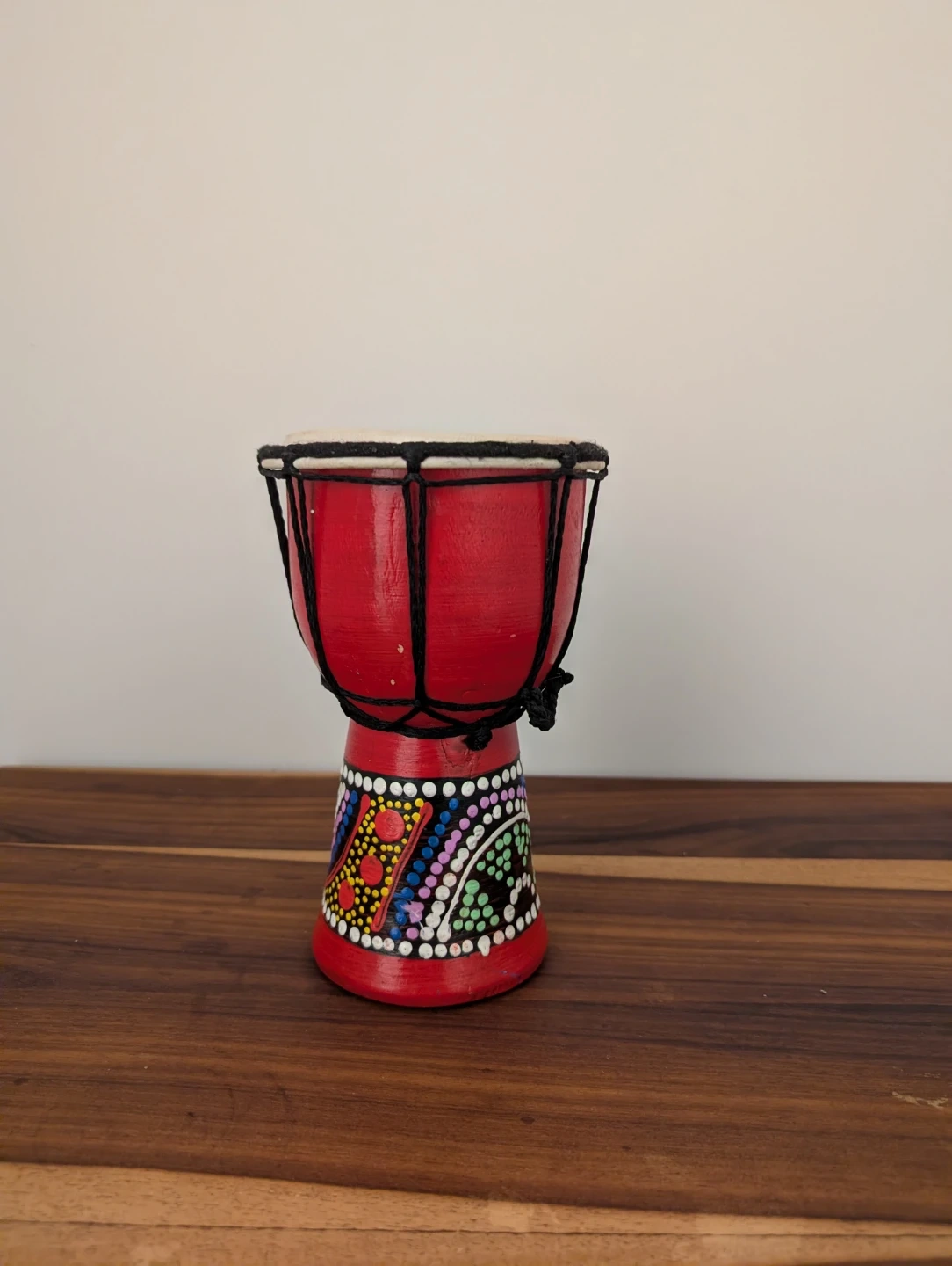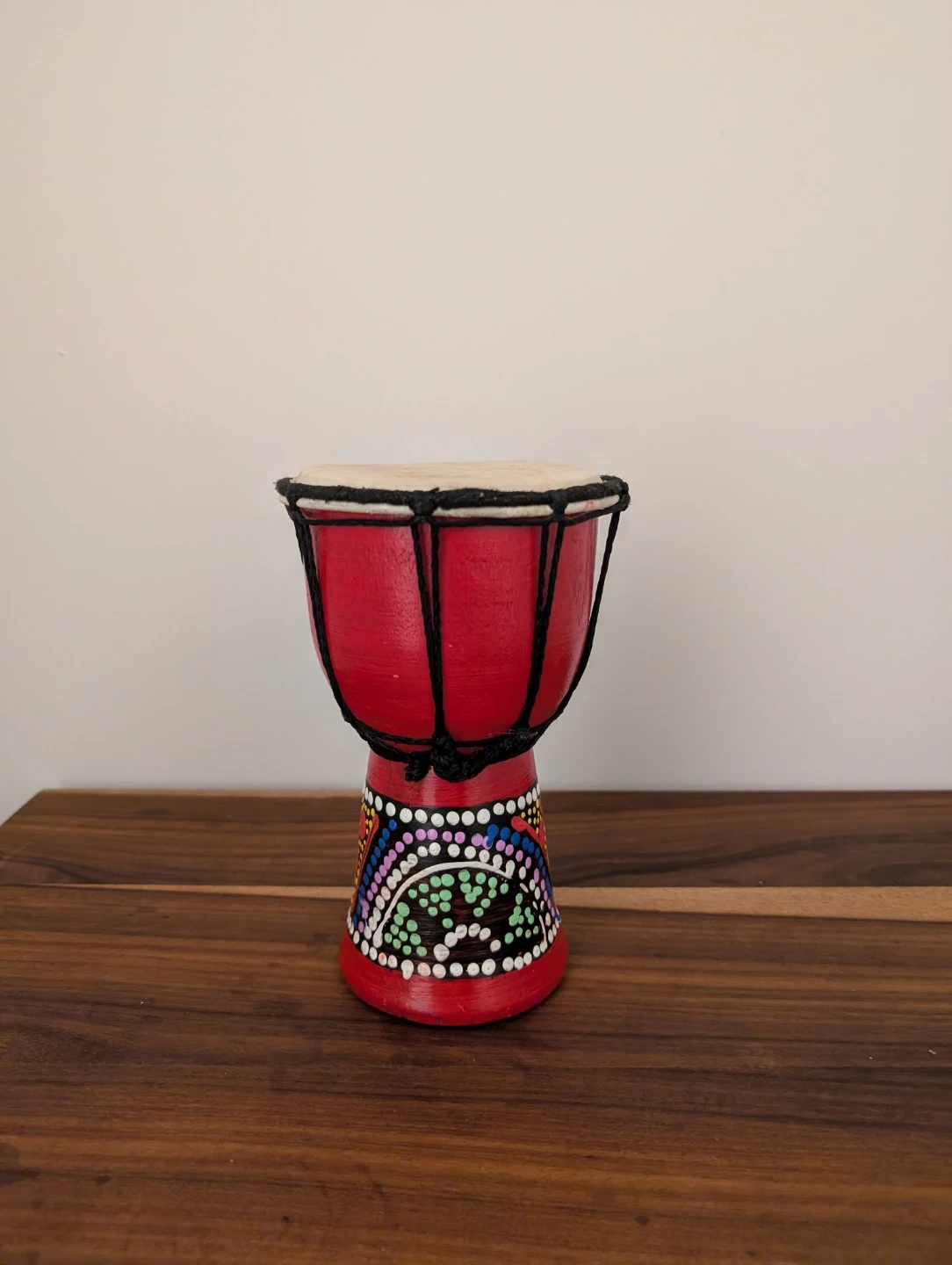 Selling a fun little red djembe drum! It's got a colourful design and is perfect for anyone wanting to try out a new instrument or add some flair to their music. It’s in good condition and ready to play!