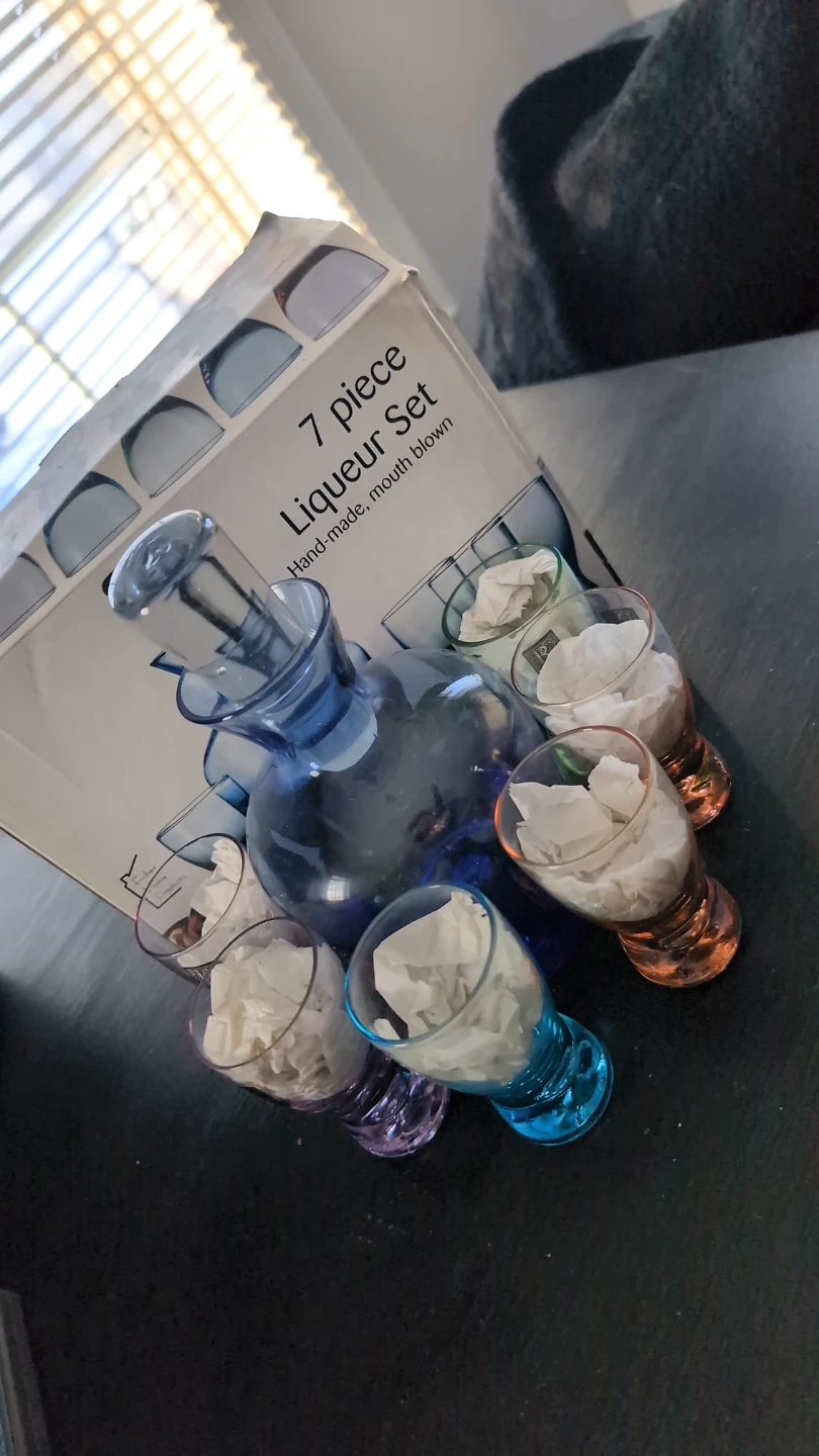 Selling a brand new, in-box 7 piece liqueur set. It's hand-made and mouth blown, adding a touch of elegance to any occasion. The set includes a decanter and six glasses, perfect for serving your favourite liqueurs. The set is still in its original packaging.