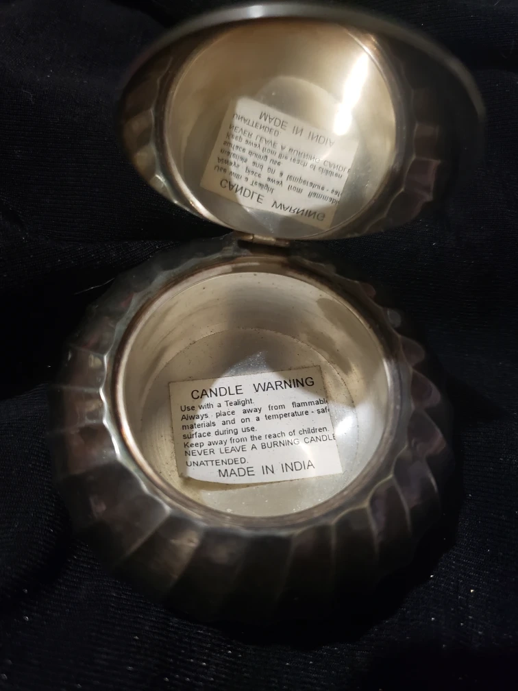 Selling a vintage candle holder, marked "Made in India" on the bottom. It has a unique, round design with a hinged lid. Inside, there's a warning label for candle usage. It shows some signs of wear from use, but it's still a charming piece!