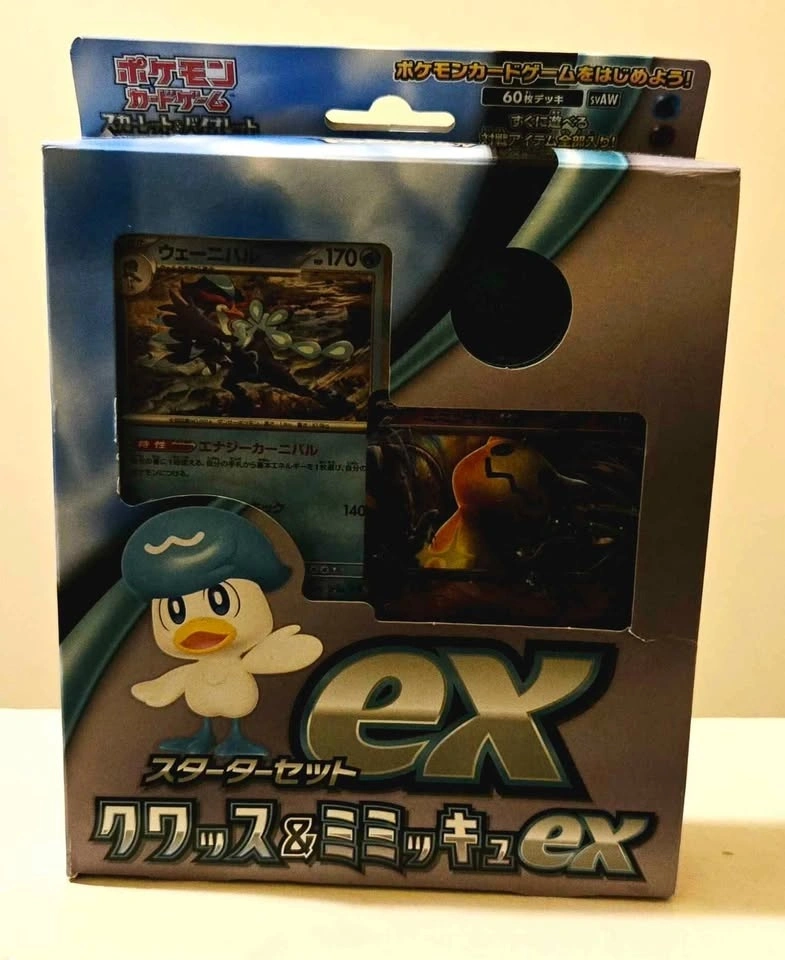 Received two starter deck ex as a gift from a friend. (I have one starter deck ex of Quaxly and Mimikyu EX as well as a Spriggatio and Riolu EX)* In term of it being Japanese. There may be a spelling mistake in the pokemon card itself. Not too familiar with pokemon characters.