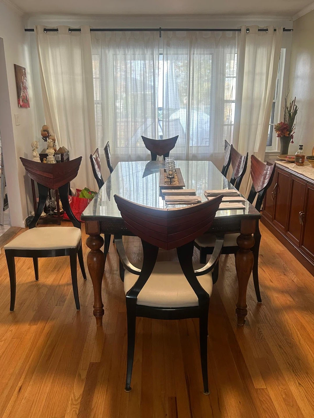 Selling a dining table with eight chairs. The table has a glass top and dark wood frame. The chairs have a unique design with wood backs and light-colored padded seats. Perfect for a large dining room!