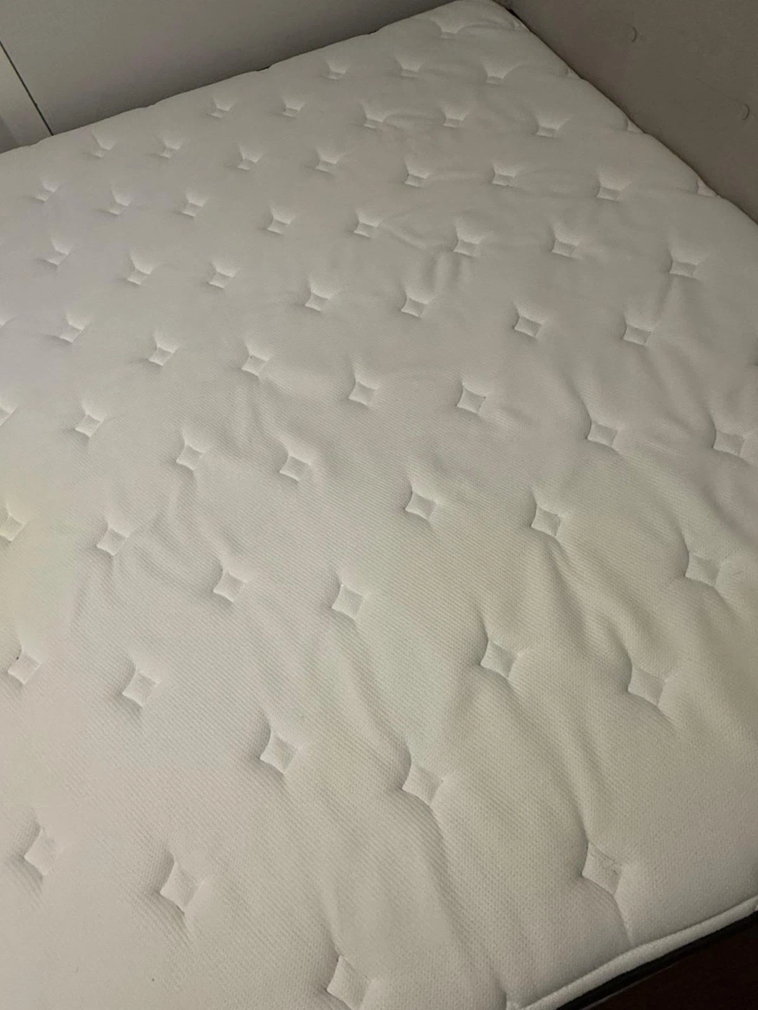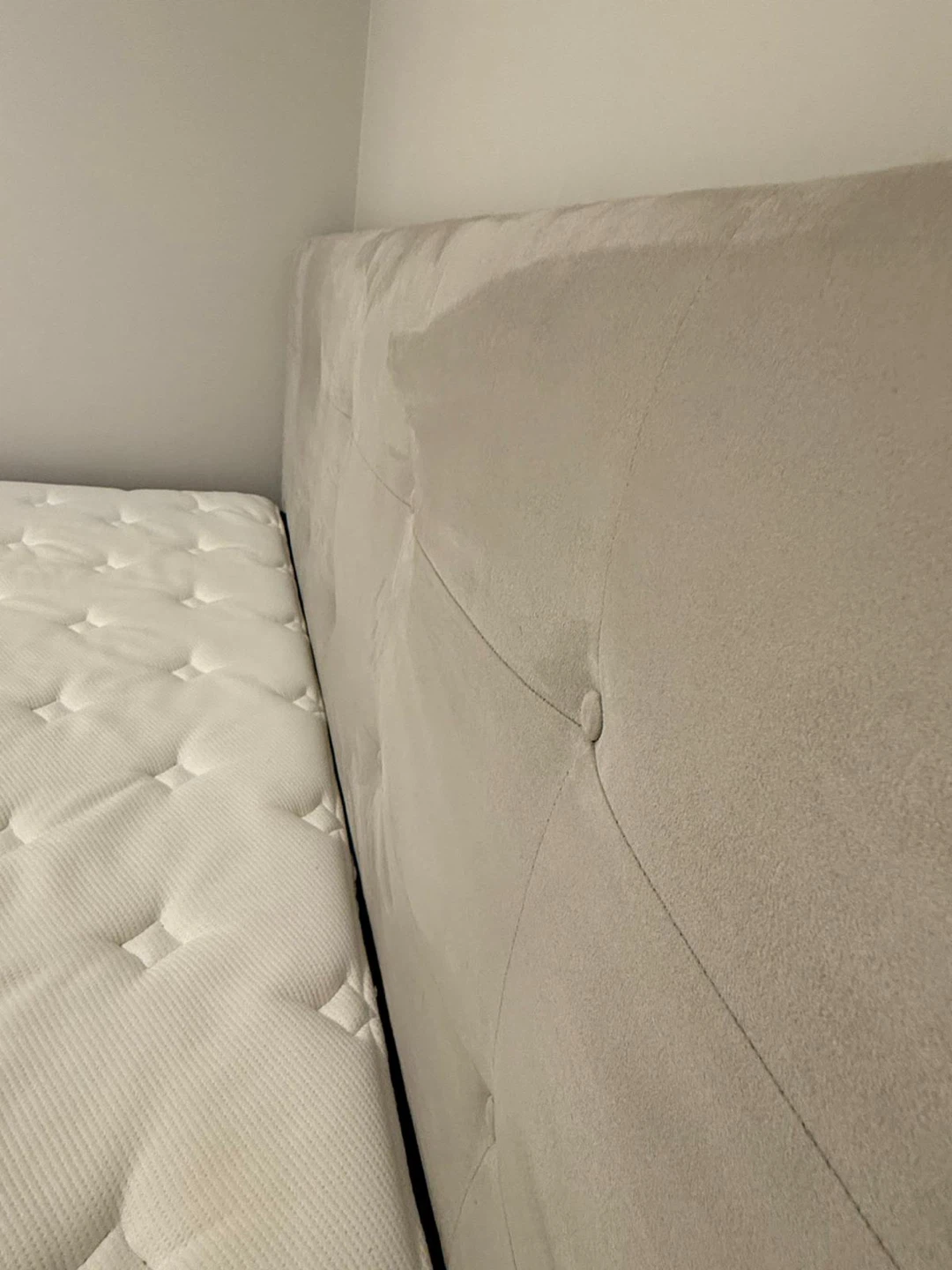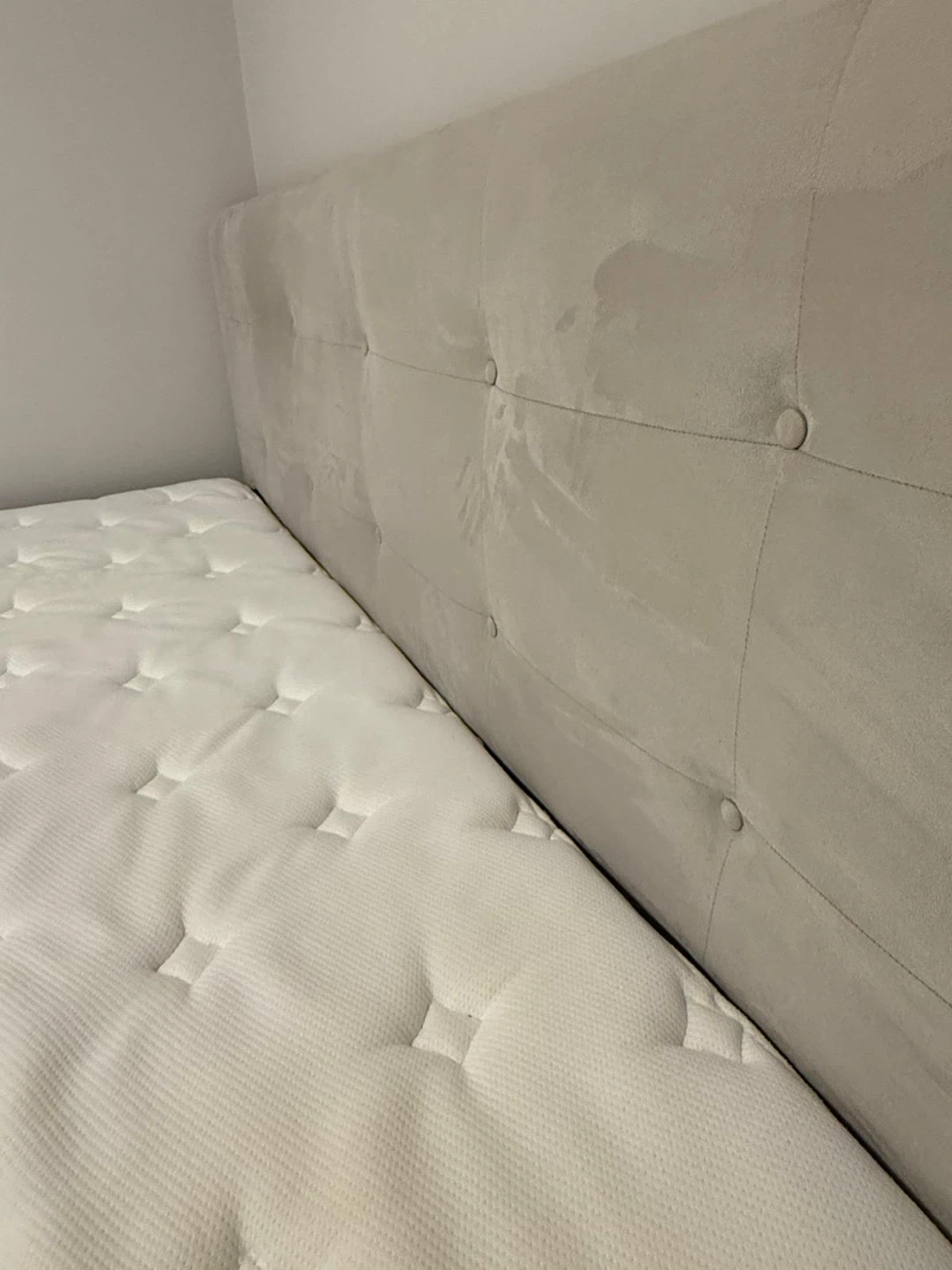 Selling a bed frame and mattress. The bed frame is upholstered and a light neutral colour. There are some stains on the headboard, as shown in the photos. The mattress is white and appears to be in good condition.