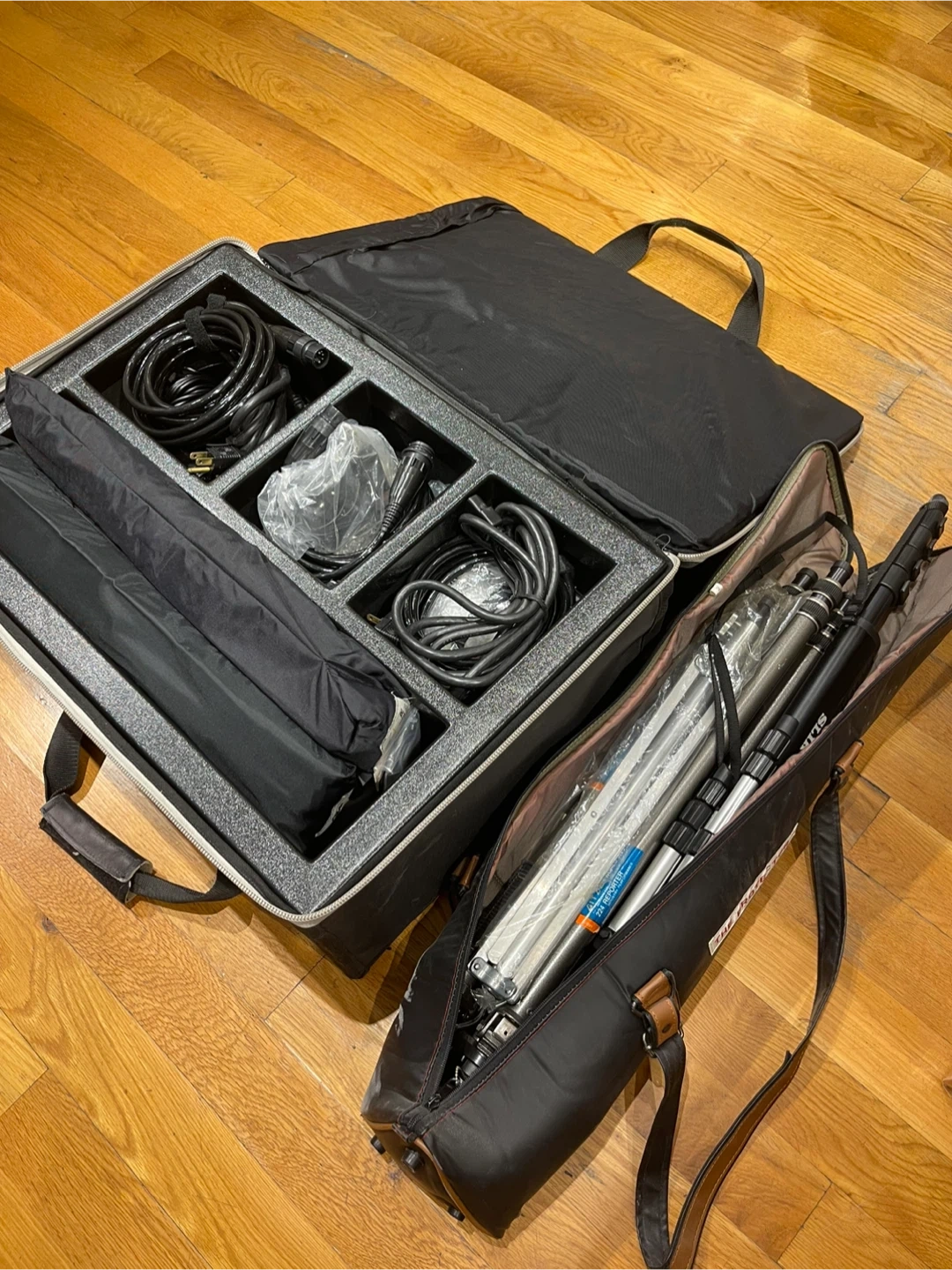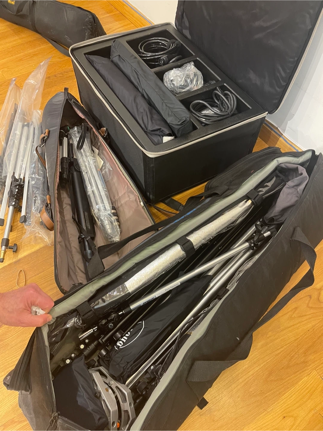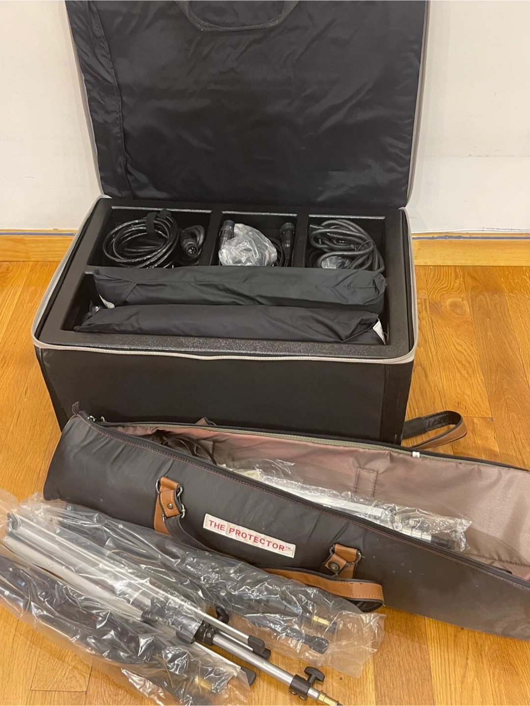 COMPLETE PROFESSIONAL PHOTOGRAPHY LIGHTING KIT WITH 3 DYNO LIGHT FLASH PROJECTORS WITH 3 COMPLETE UMBRELLA AND TRIPOD STANDS AND ALL MATCHING WIRING EQUIPEMENT IN PERFECT CONDITION, NEW AND NEVER USED BEFORE IN ORIGINAL PACKING.