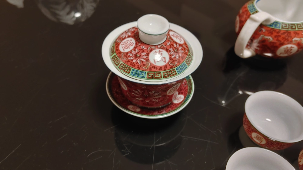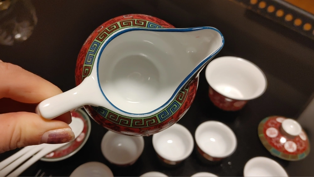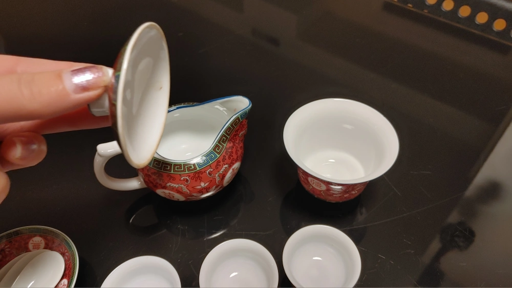 Here's a lovely Jiyuan tea set! It includes a teapot, creamer, sugar bowl, small plates, spoons, and 10 cups. It's perfect for tea with friends or family!