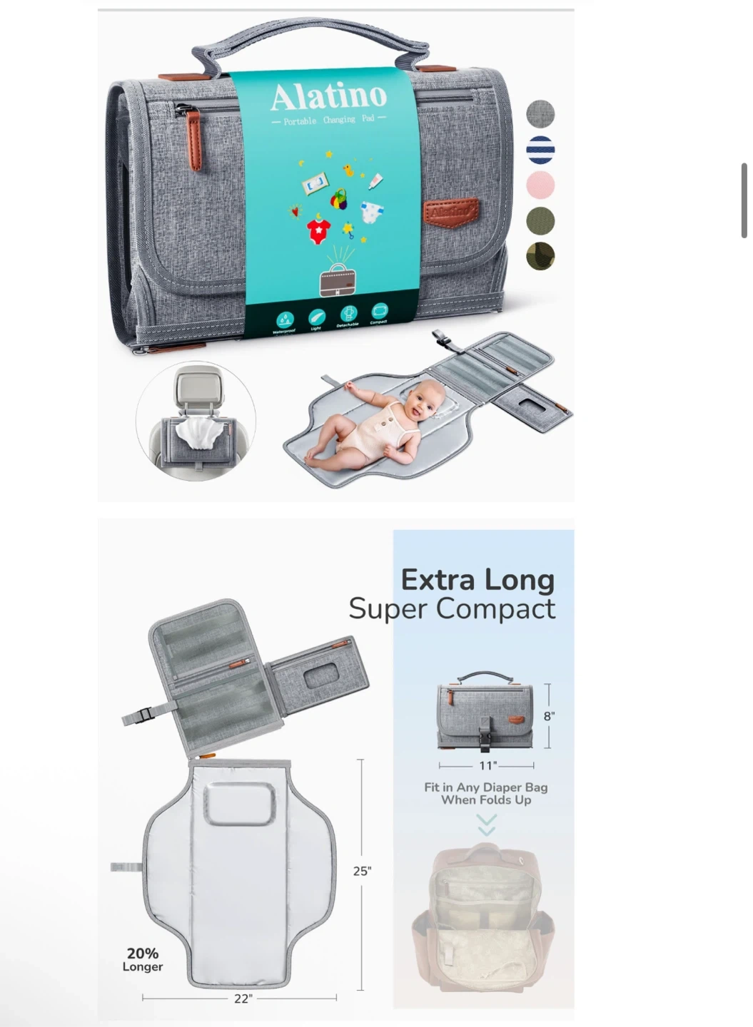 This brand new Alatino portable changing pad is perfect for on-the-go parents! It's super compact when folded, fitting easily into any diaper bag. It measures 30.5L x 20.3W x 7.1H centimetres and weighs only 0.36 kilograms. The pad extends to be extra long and is 20% longer than other brands. It's brand new and ready to make diaper changes easier!