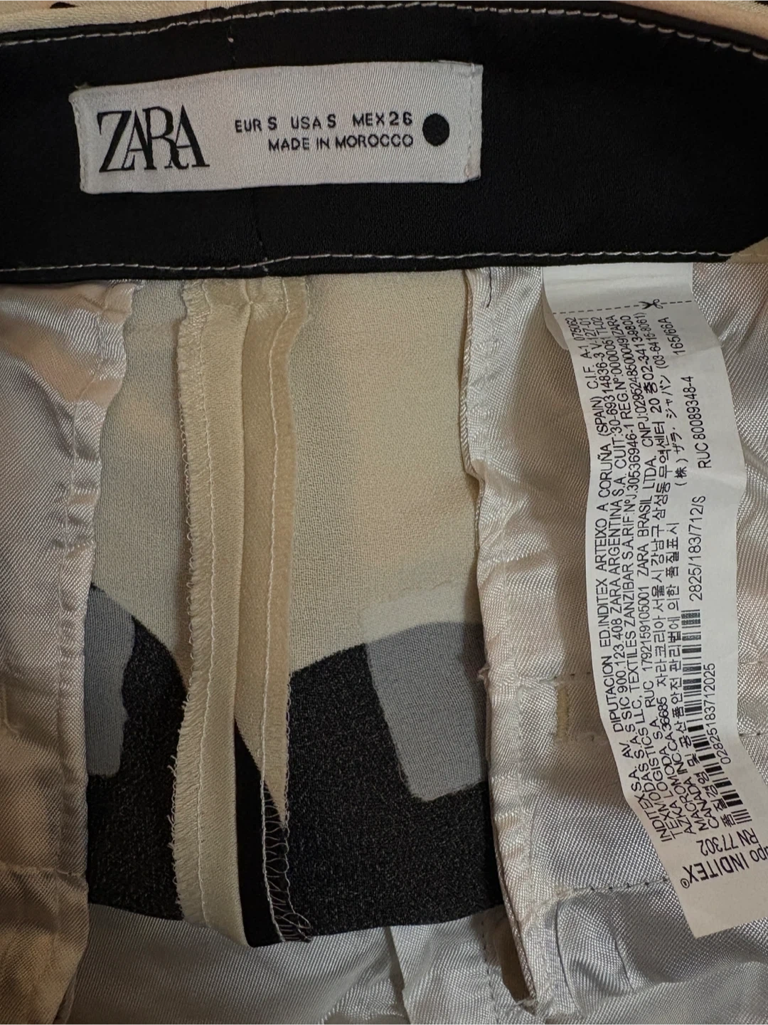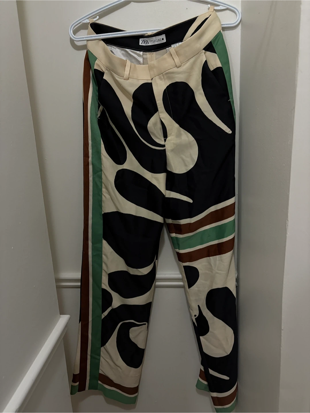 Stylish Zara pants with a unique print! These are a size S and made in Morocco. They feature a cool design with black, white, and green accents. Perfect for adding a pop to your wardrobe!