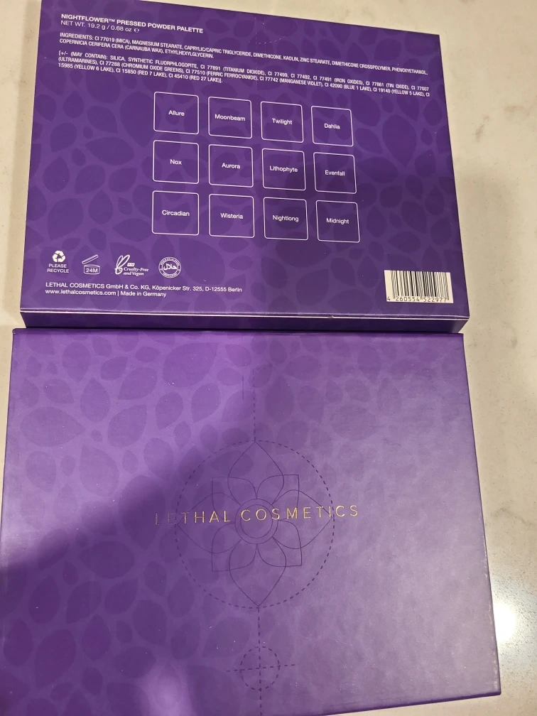 Lethal Cosmetics Nightflower Eyeshadow palette. It features a range of beautiful shades including Allure, Moonbeam, Twilight, Dahlia, Nox, Aurora, Lithophyte, Evenfall, Circadian, Wisteria, Nightlong, and Midnight. Perfect for creating a variety of stunning eye looks!