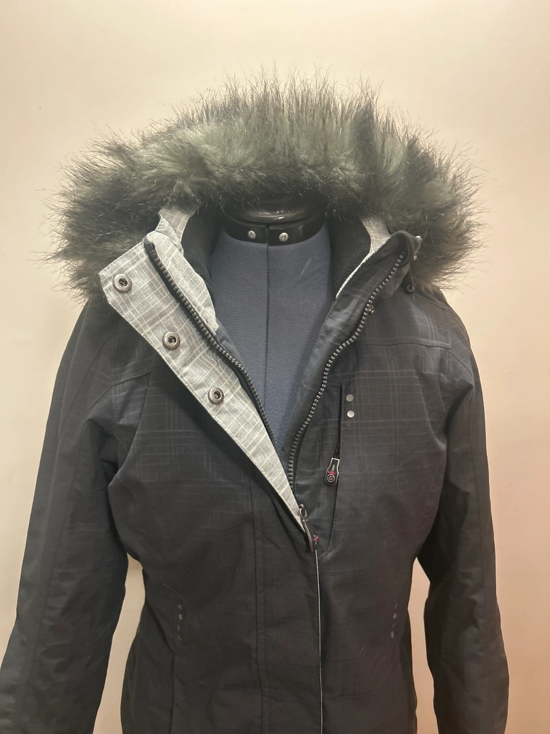 Stylish grey patterned fabric with reflective dots, lots of pockets and removable fur trim. great for winter sports or enjoying the colder seasons!
