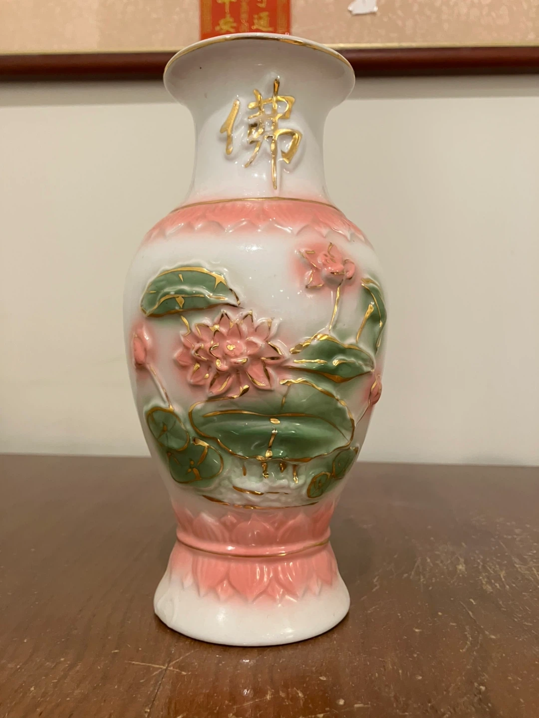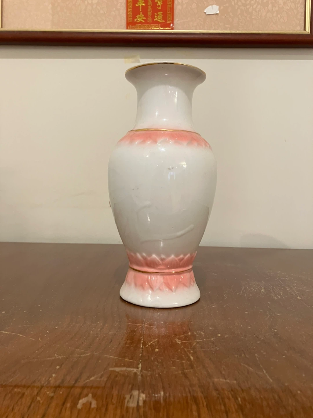 - This is a lovely vase, decorated with pink flowers and green leaves with gold accents. It would be a beautiful addition to any room!