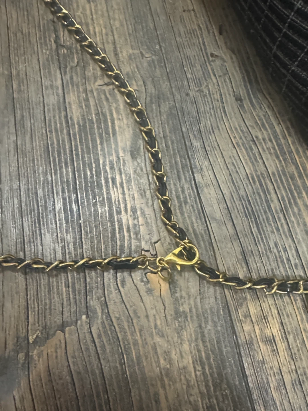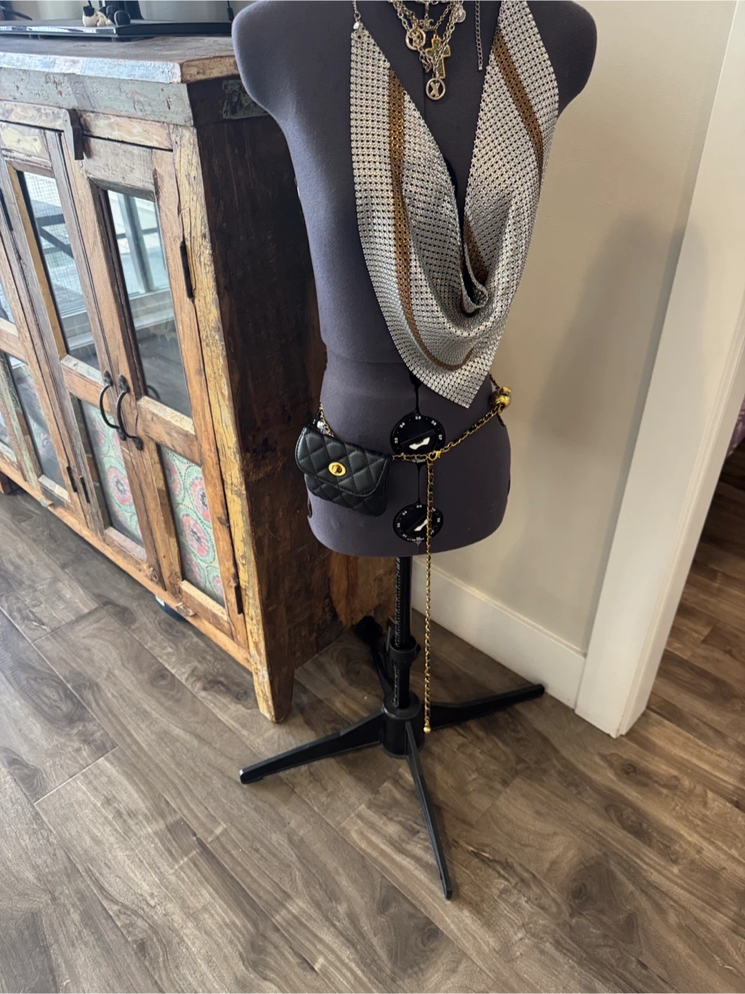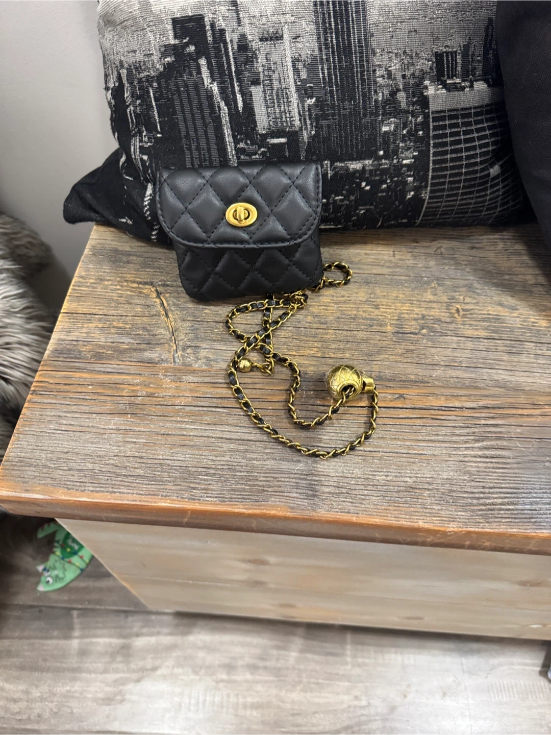 Small black quilted faux leather bag with a stylish chain strap. Adjustable strep. Ball moves but has no purpose & could be removed. Perfect for keys or air pods