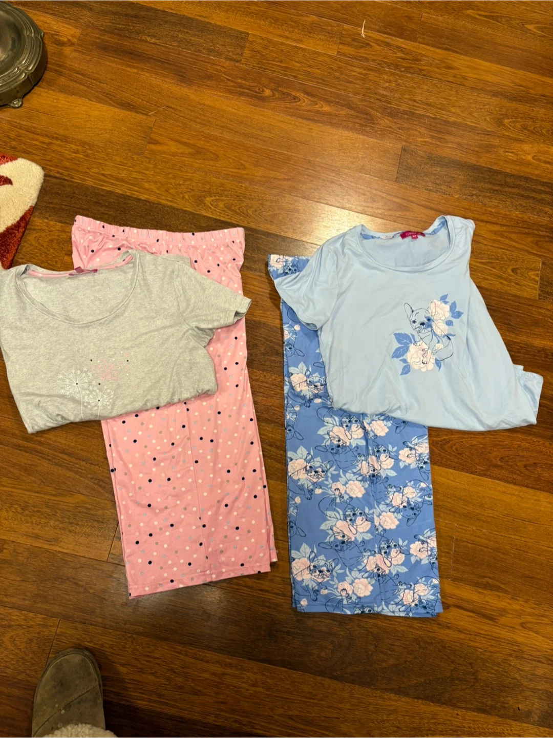 Two PJ sets for sale! One is light blue with a floral pattern and the other is grey and pink with polka dots. Both are size S/P and in great condition! $5.00 for both.