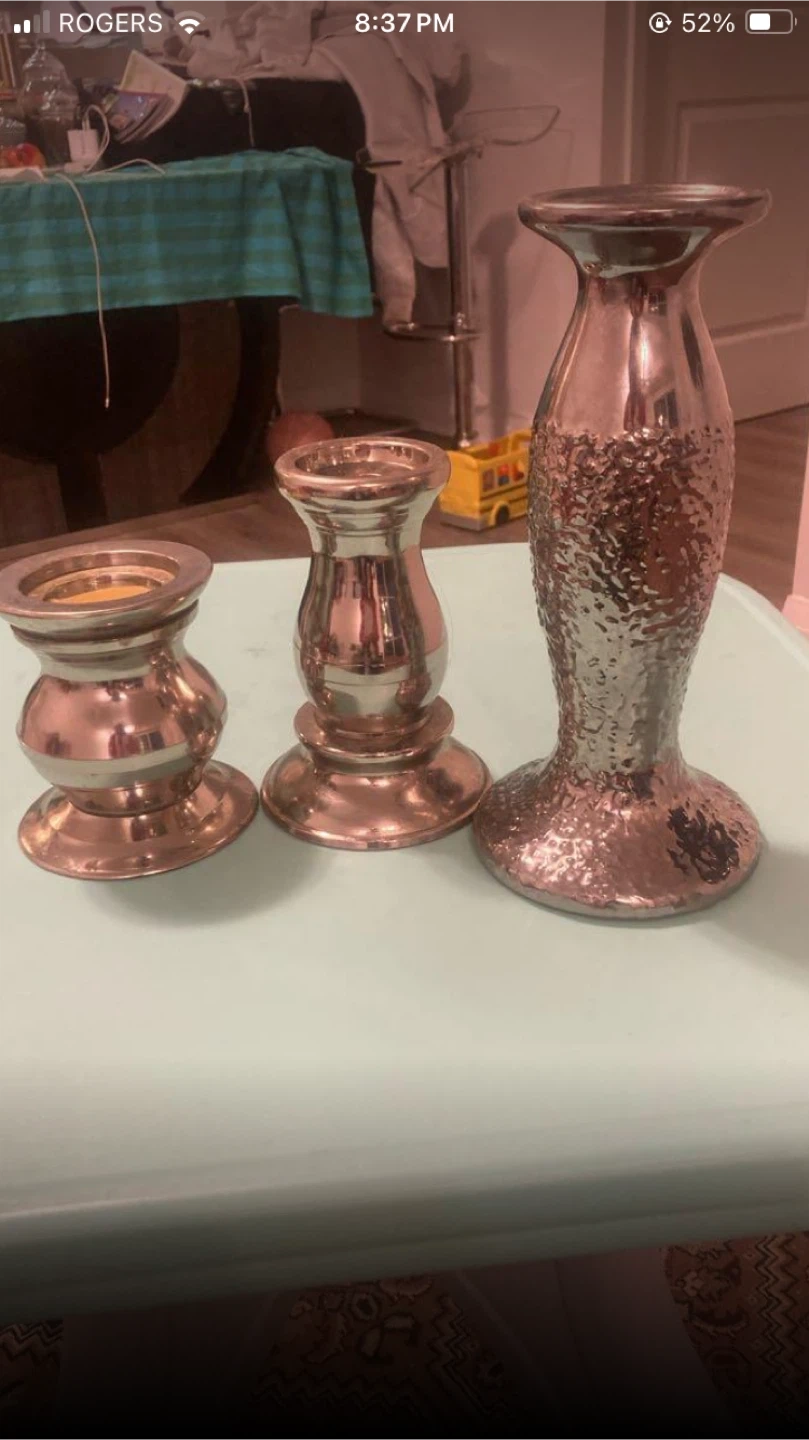 Selling a set of three candle holders. They have a metallic finish and would look great as a centrepiece or on a mantelpiece. The set includes three different sizes and styles as pictured