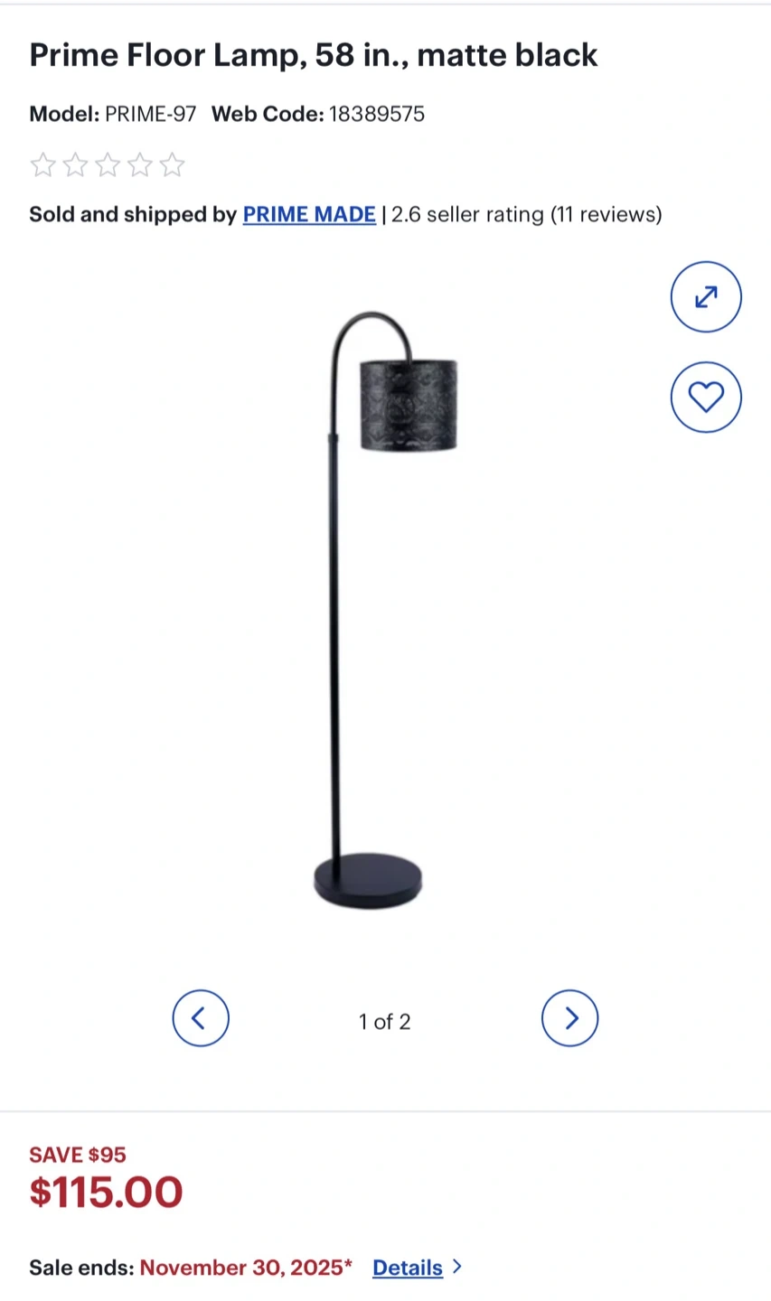 Selling a Prime floor lamp in matte black. Was never used just don’t have the box for it.It's in great condition and would look fantastic in any room. The lamp stands at 58 inches tall. It has a unique patterned shade that adds a touch of elegance to your space