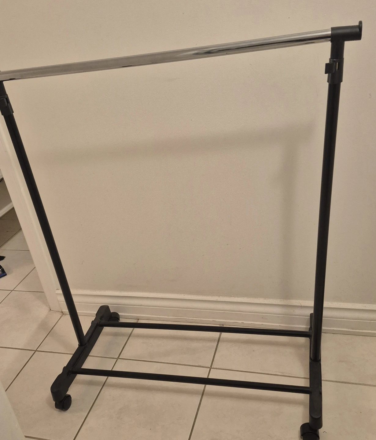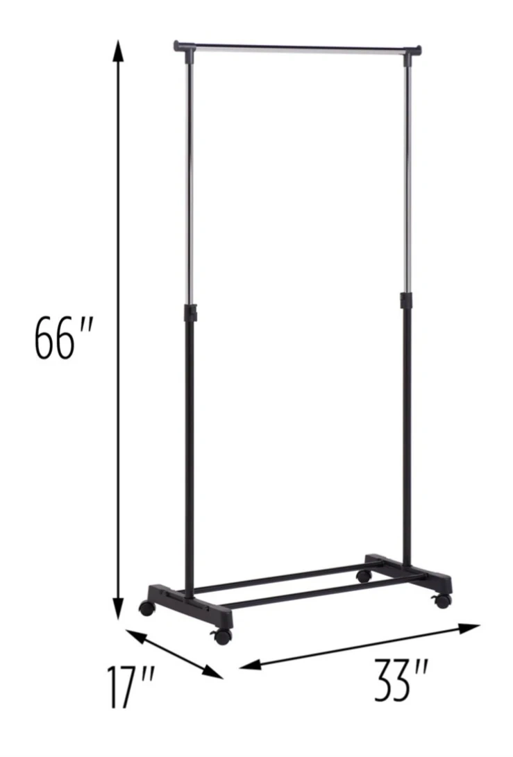I'm selling a height adjustable clothes rack. It has a bottom shoe rack that provides additional space. The dimensions are 66" height, 17" width, and 33" length. It's in good condition and ready for a new home!