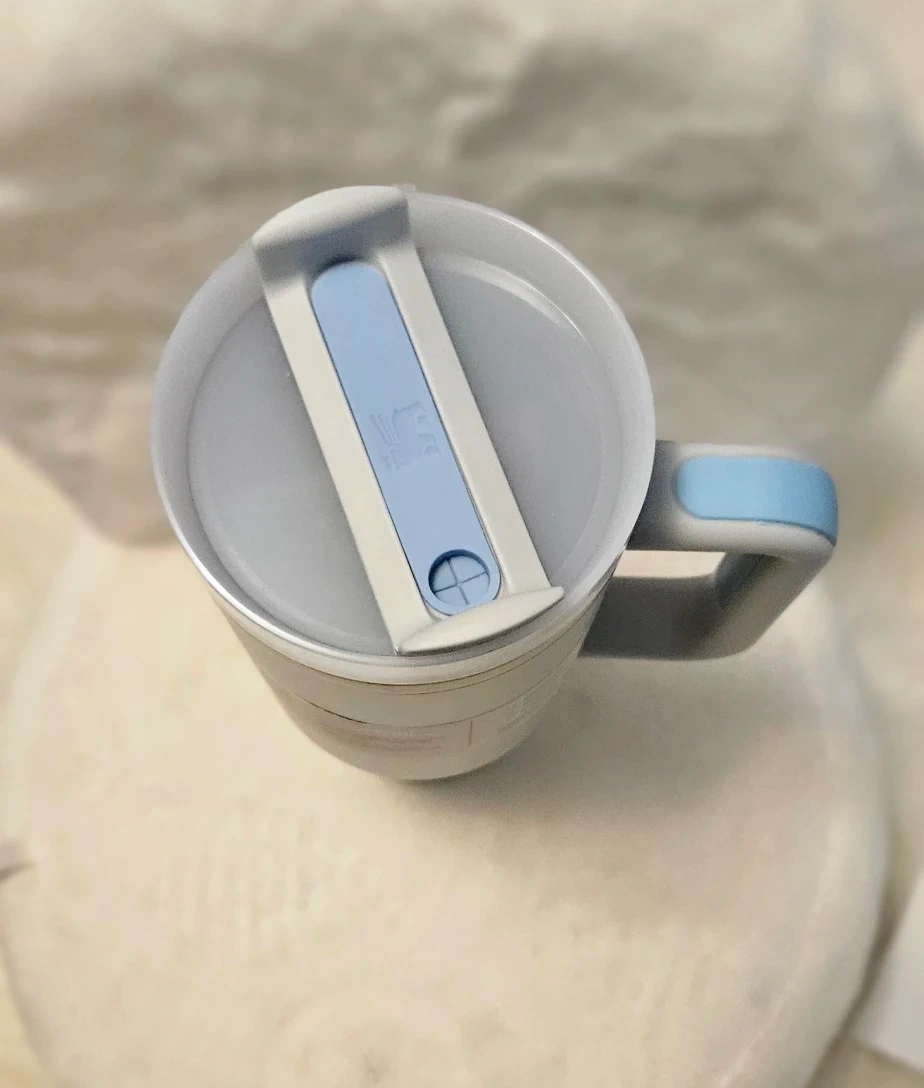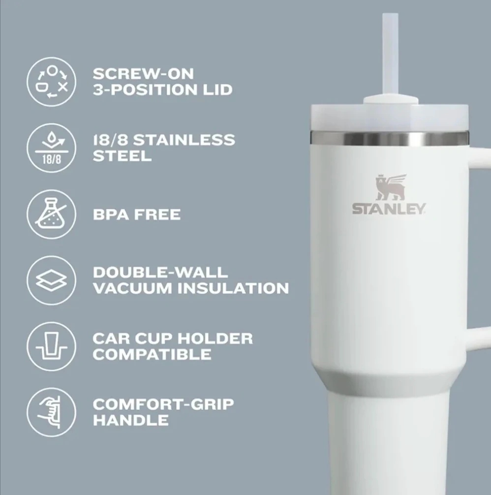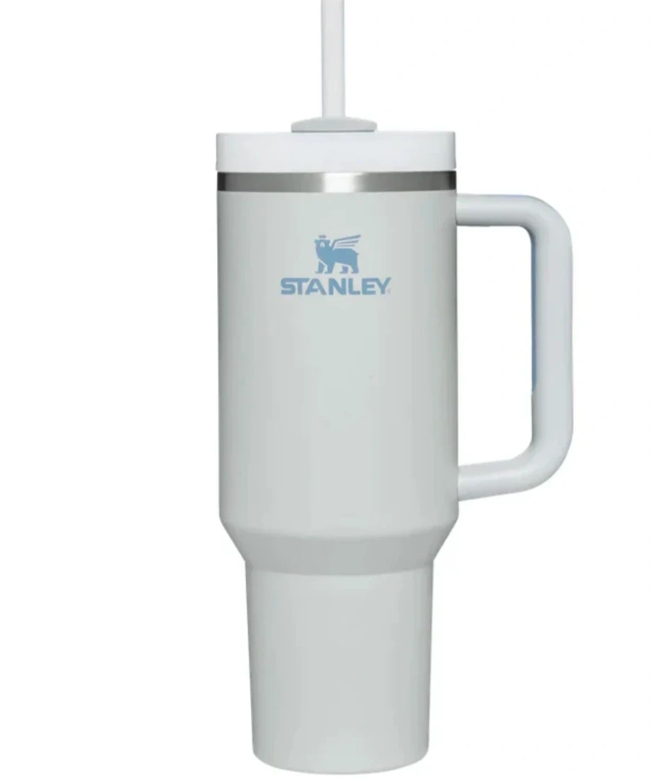 BNIB Stanley Quencher H2.0 FlowState Tumbler in Fog, 40oz! It features a screw-on 3-position lid, is made of 18/8 stainless steel, and is BPA free. It also has double-wall vacuum insulation and is car cup holder compatible, with a comfort-grip handle. Comes with the box