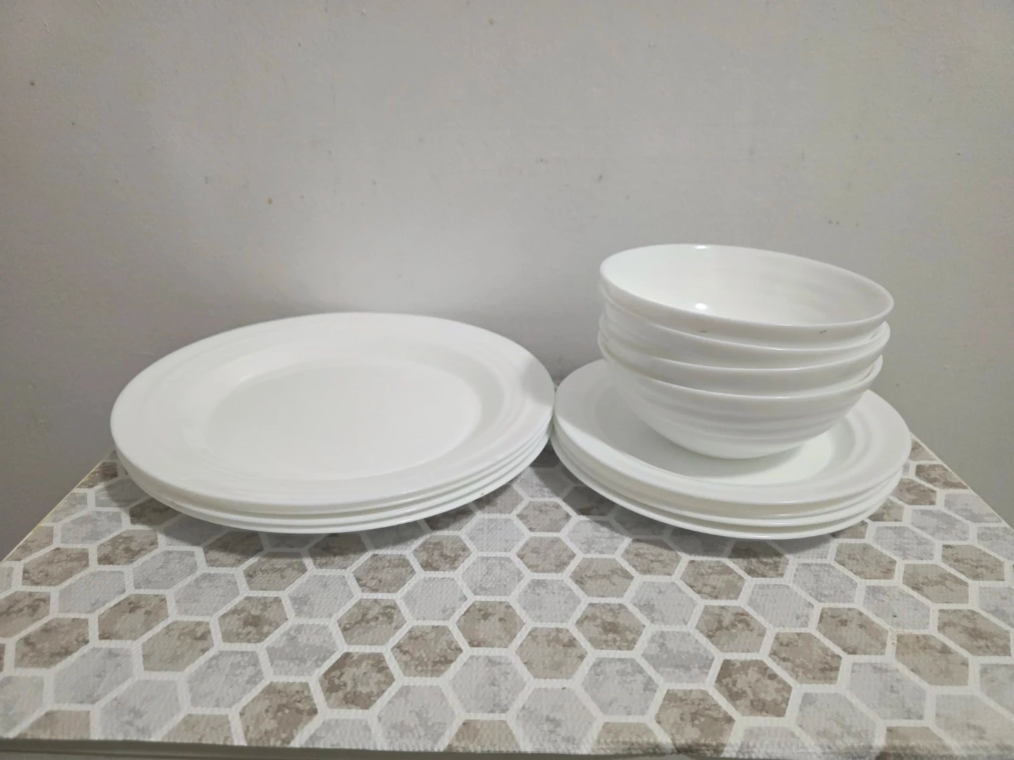 Selling a set of white dinnerware, which includes plates and bowls. Perfect for everyday use or special occasions. They're in great condition and ready for a new home!