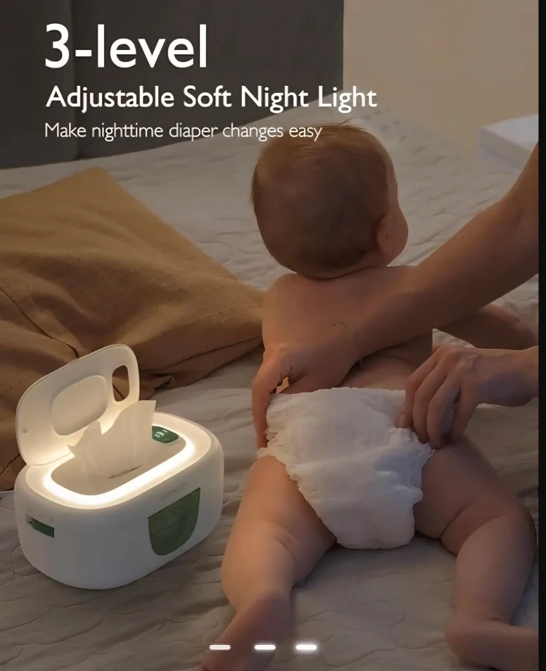 THREE-LEVEL LIGHT ADJUSTMENT: Diaper wipe warmer built-in night light, you can adjust the brightness according to your needs and illuminate the changing table during late-night diaper changes; Avoid indoor light from shining into sleeping baby's eyes