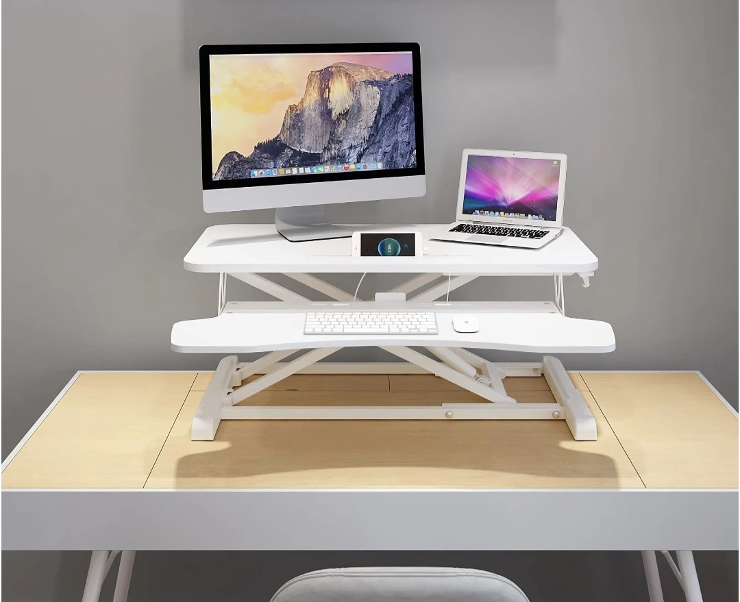 - Ergonomic two-tier design lets you keep your monitor and laptop elevated while typing comfortably below