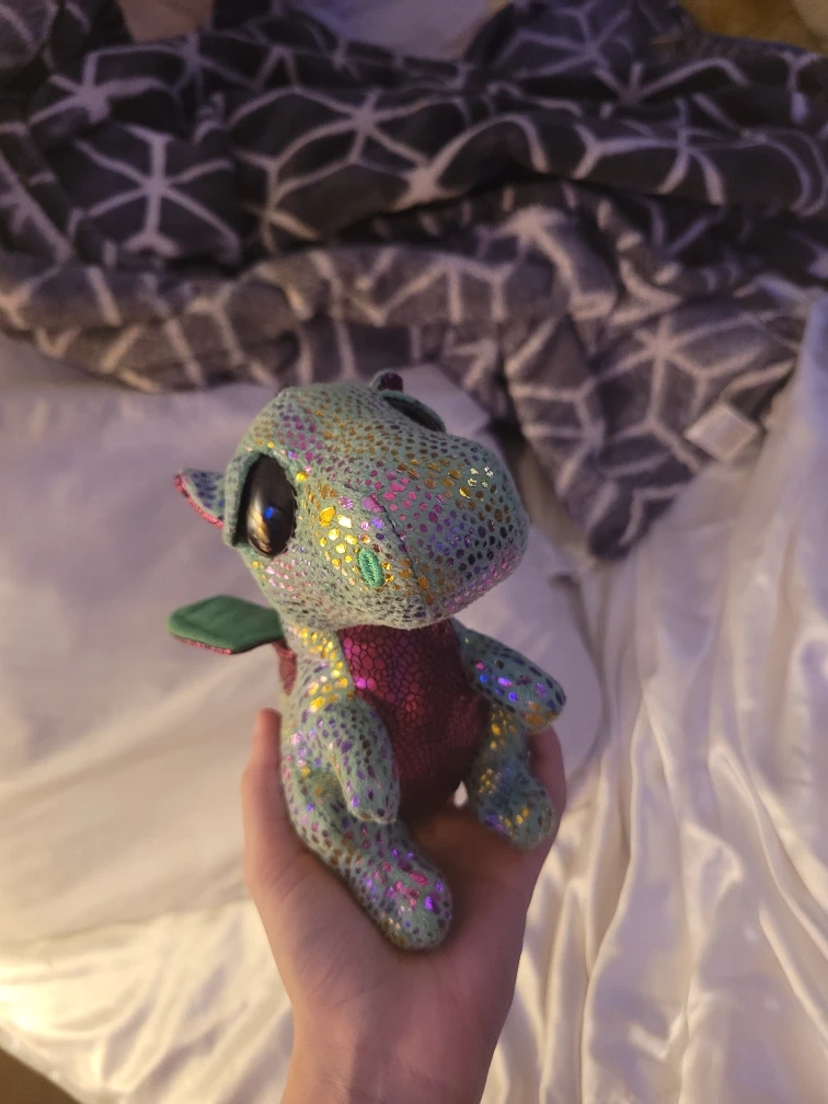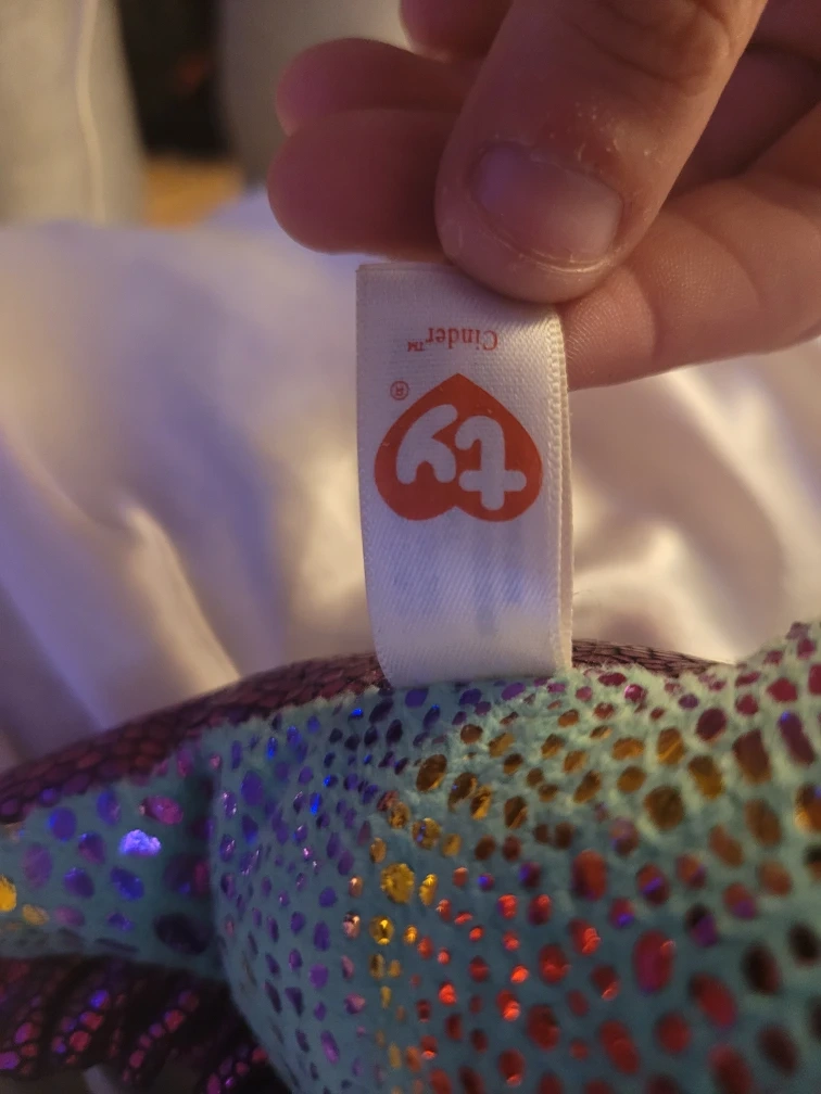 This is a cute Ty Beanie Boo named Cinder! It's a dragon plush with sparkly details and big, adorable eyes. It's in great condition and ready for a new home!