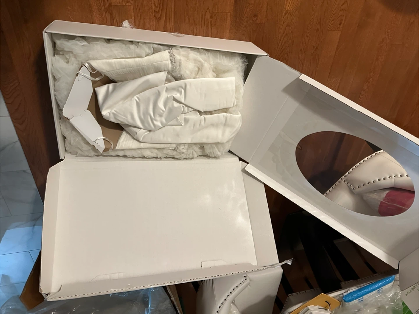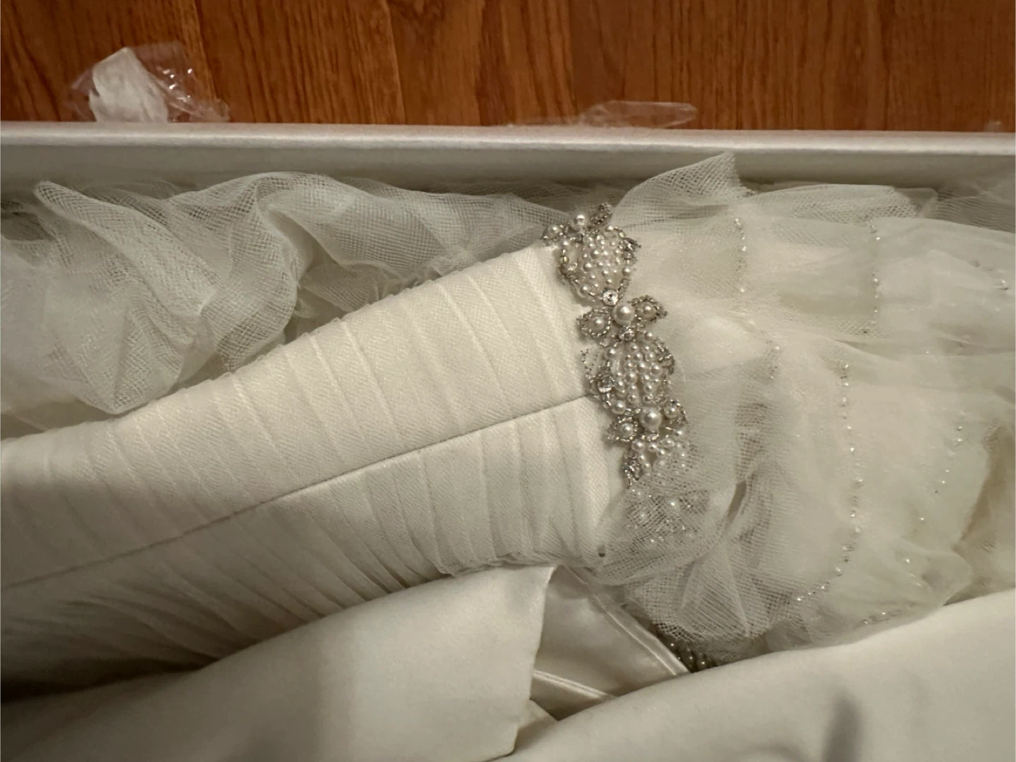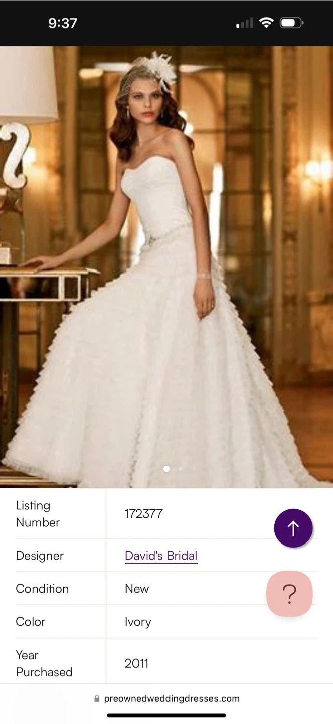 A beautiful wedding dress from David's Bridal! It's in ivory. This dress is magical and has been dry cleaned and has maintained its integrity in the dry cleaned box.