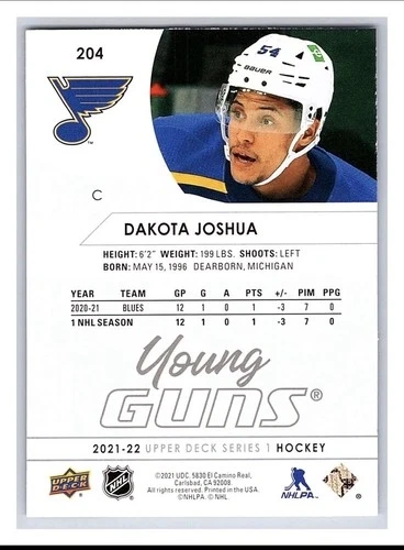 Elevate your sports trading card collection with the 2021-22 Dakota Joshua UD Young Guns Rookie card, now a treasured piece for any Toronto Maple Leafs fan. This sought-after card, numbered #204, features the St. Louis Blues alum during his impressive rookie season, capturing the potential of the promising ice hockey talent. Crafted by the renowned Upper Deck manufacturer and part of the prestigious 2021-22 Upper Deck set, this original, non-autographed card is a must-have for enthusiasts and collectors. The card, which is produced in Canada and part of the National Hockey League (NHL) memorabilia, is a stellar addition to any collection celebrating the sport's emerging stars.