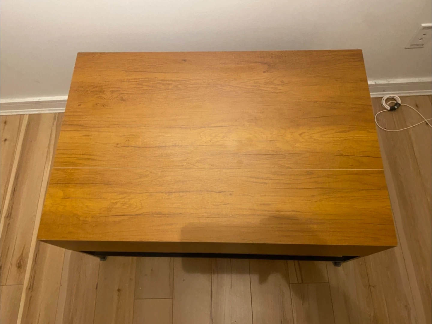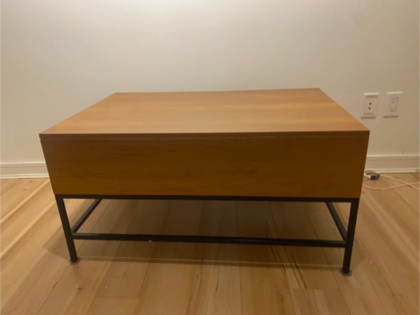 Selling a lift-top coffee table with a wooden top and a metal frame. It's in great condition and perfect for adding extra storage and functionality to your living room. The lift-top mechanism works smoothly, making it easy to use as a workspace or for enjoying a meal while relaxing on the couch