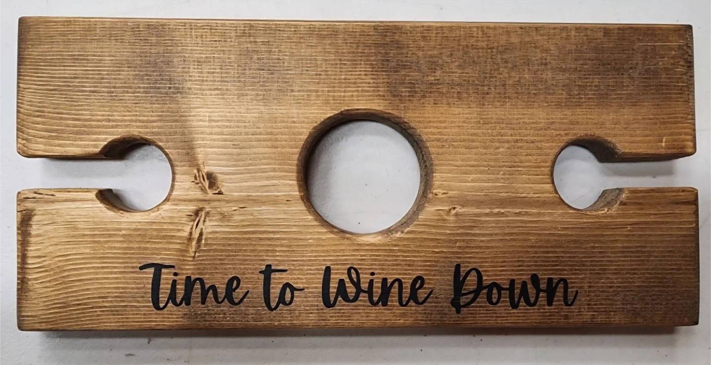 Selling new wooden wine glass holders, perfect for adding a touch of fun to your home decor or a fun idea for Christmas gift! It comfortably holds two wine glasses and a bottle of wine.