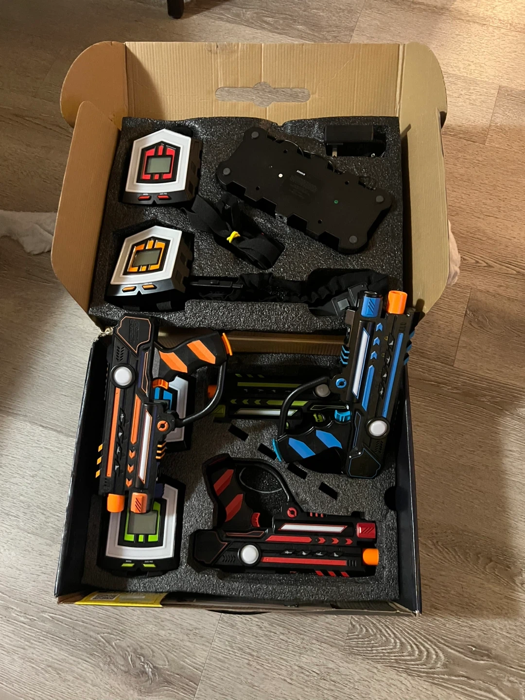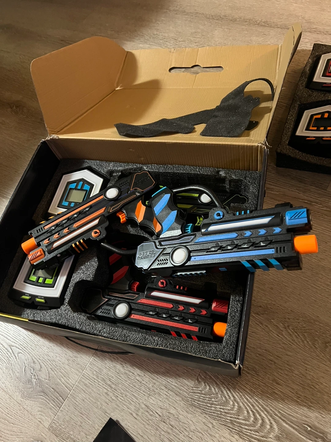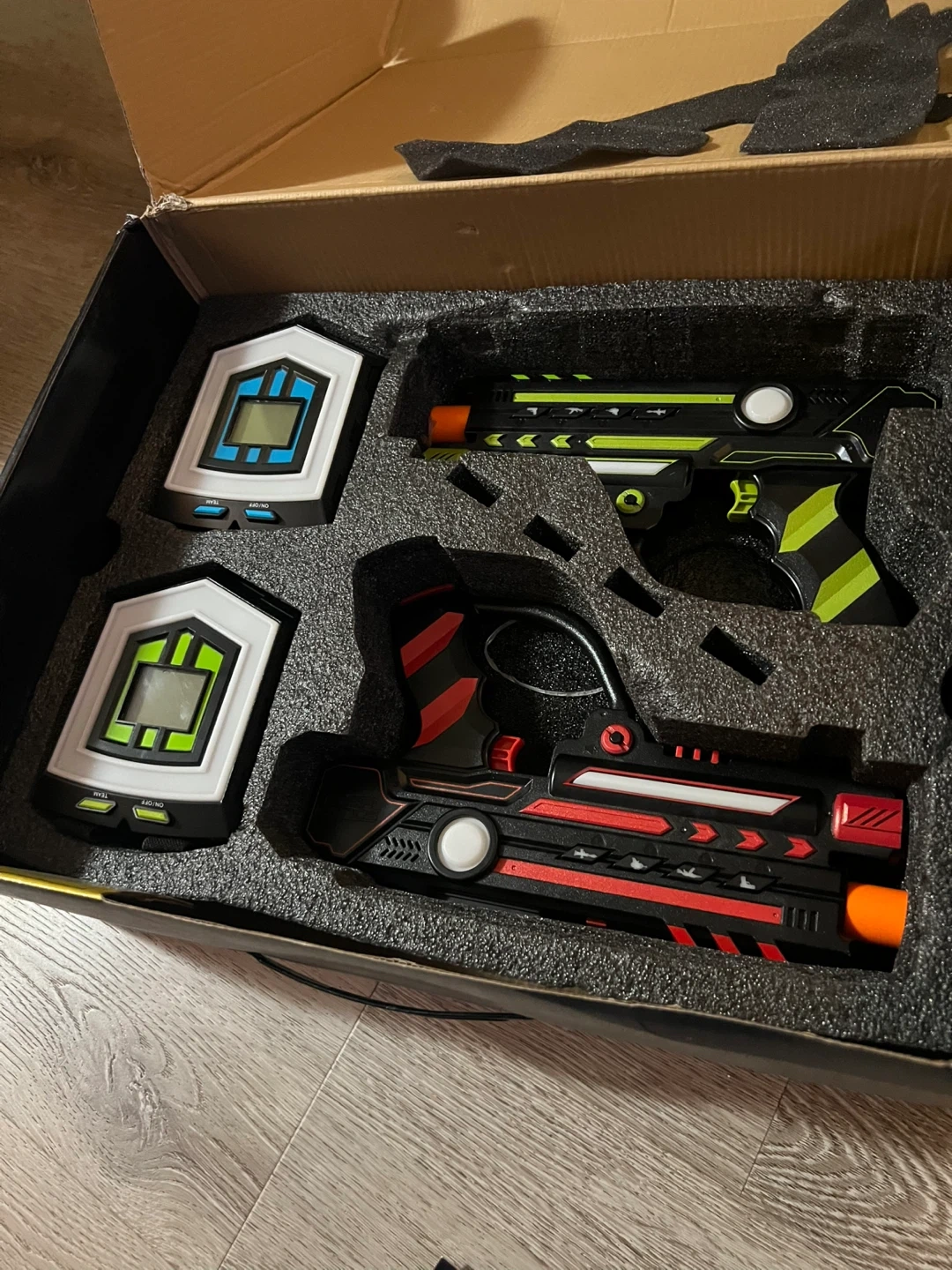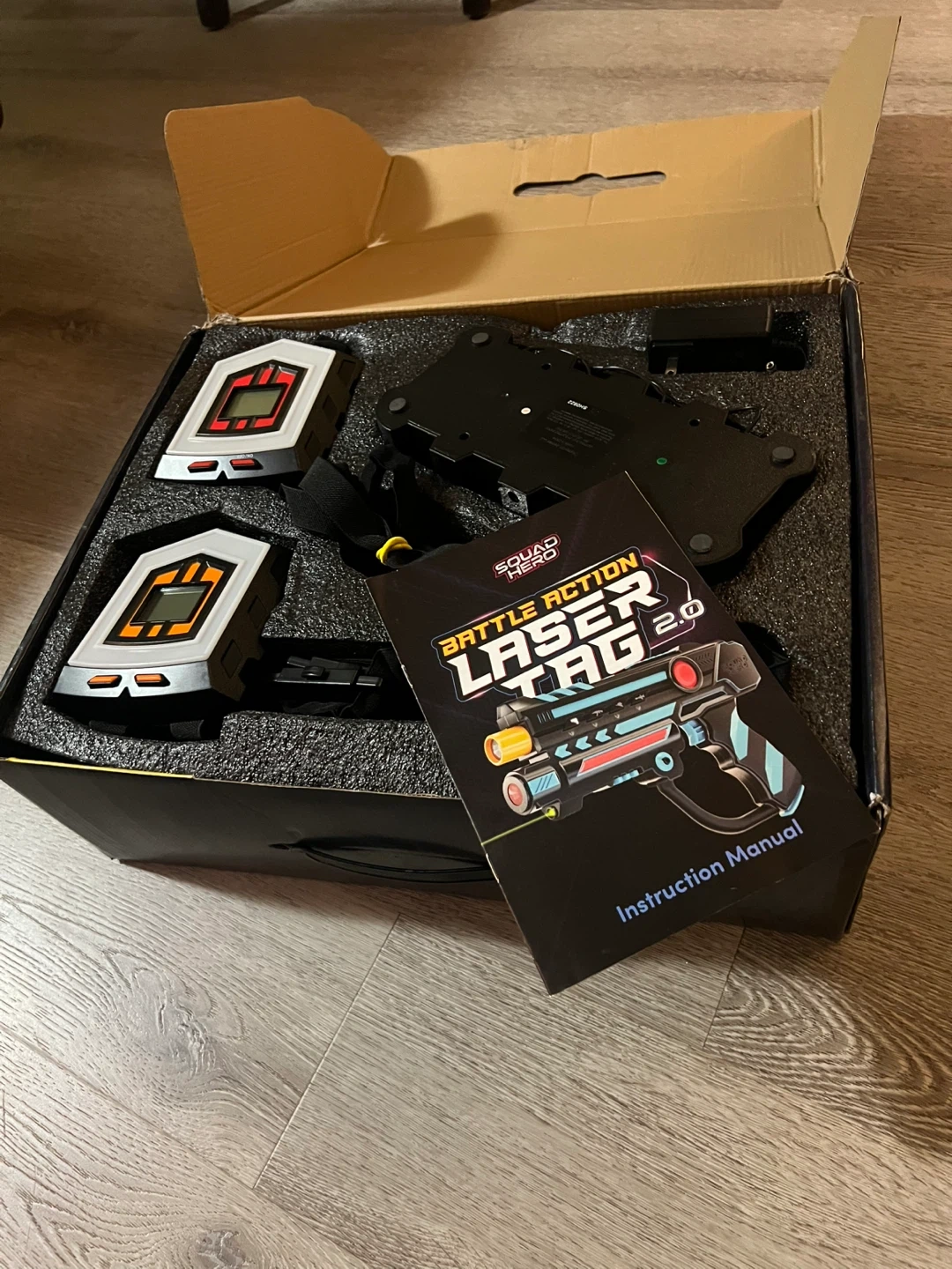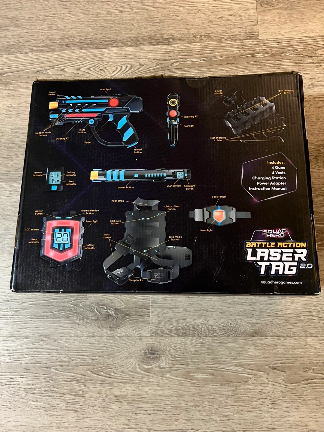 Get ready for some action with this Squad Hero Battle Action Laser Tag 2.0 set! It comes with everything you need for a fun and engaging game. The set includes 4 laser tag guns and 4 vests, with LCD displays. It features 360° combat with 3 target zones on the gun, chest, and back. Perfect for ages 8+ and 2-4 players. The box and instruction manual are included!