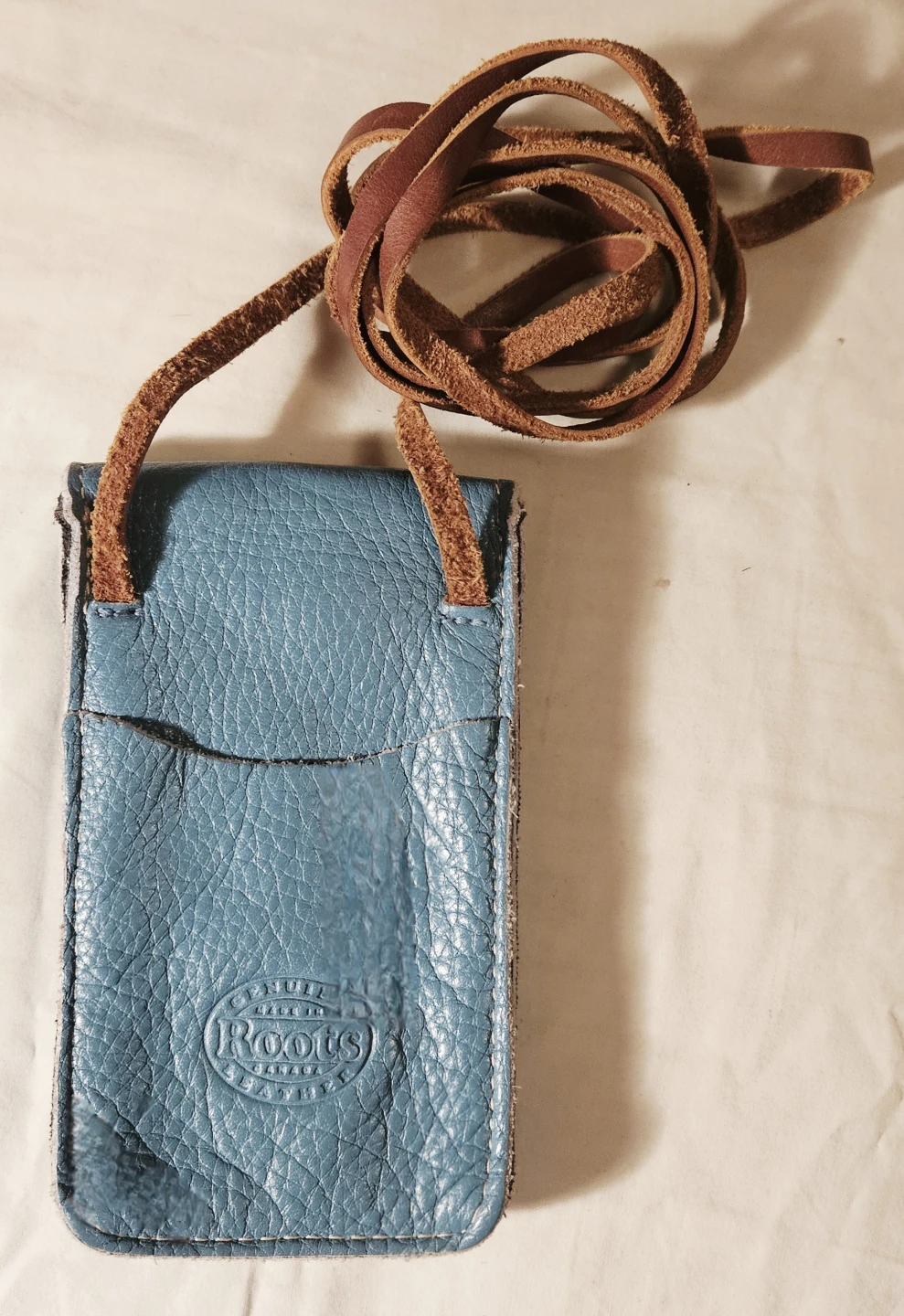 Selling a cute Roots leather pouch! It's a lovely blue colour with a brown leather strap. Perfect for keeping your cash, phone and other miscellaneous items, stylish on the go.