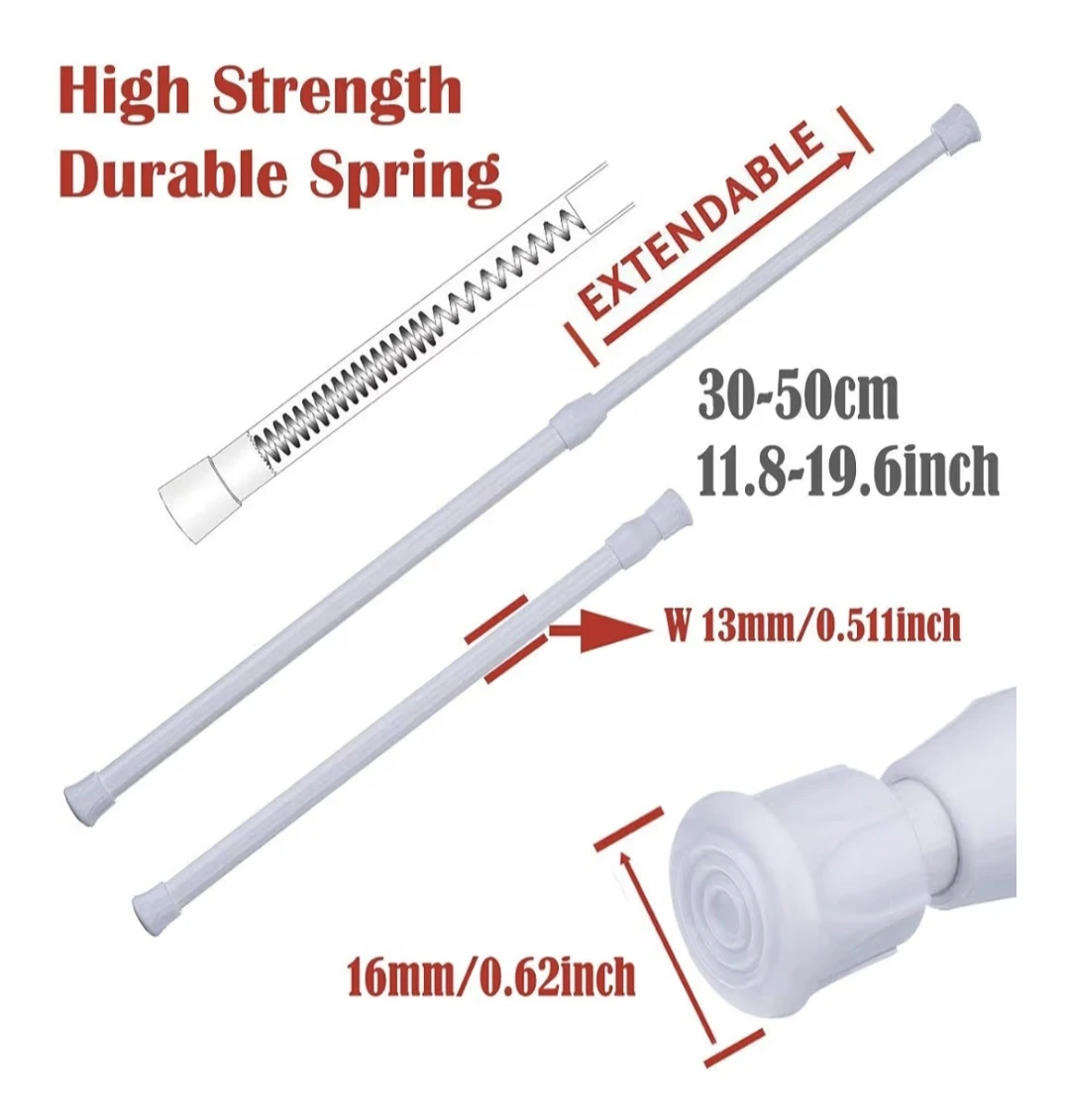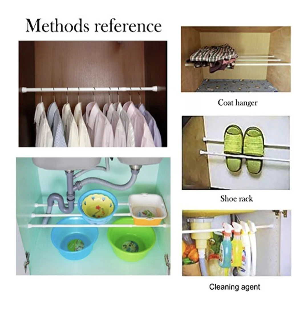 VERSATILE HANGING OPTIONS - -In addition to being placed between two walls in a bathroom for hanging a shower curtain, our spring tension rod can also be used in other areas of the home such as bedroom, living room, dining room, kitchen, small closet or window. For small spaces, it can be used to hang a curtain in lieu of a closet door, or to be wardrobe bars, laundry clothes drying rack. It can apply on smooth or rough walls with wallpaper, tile, or wooden frame