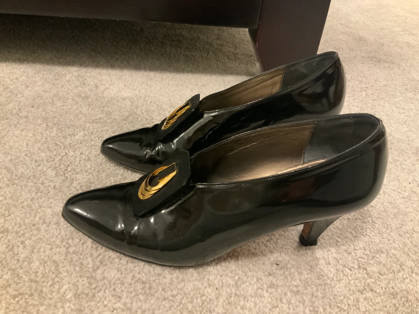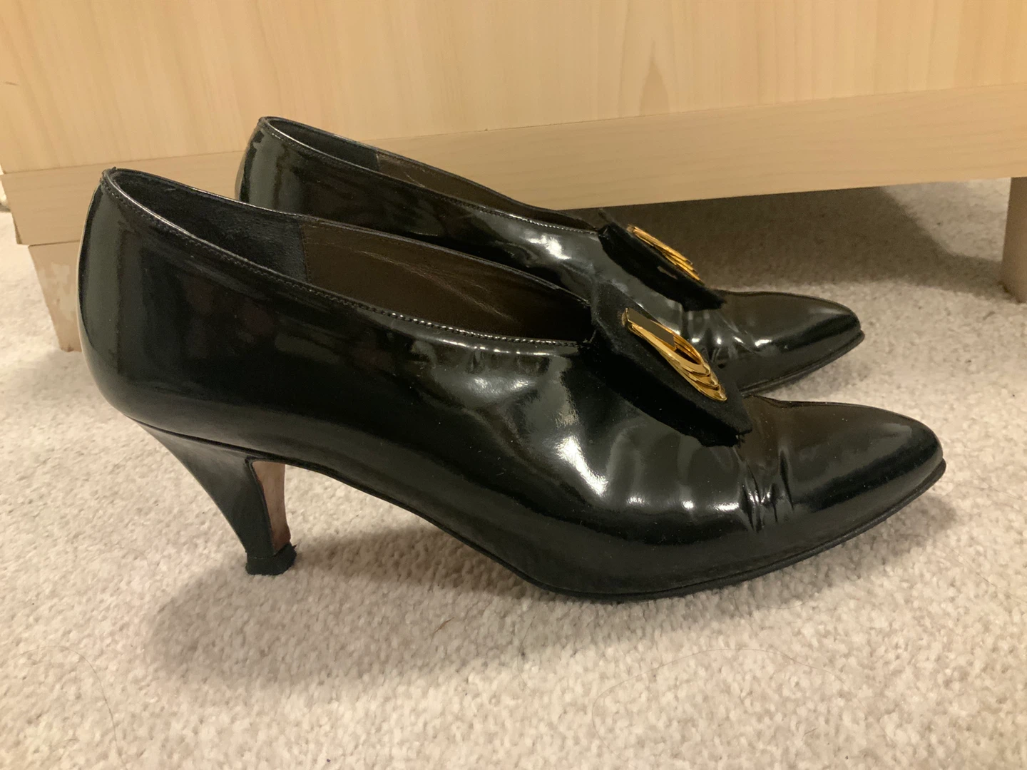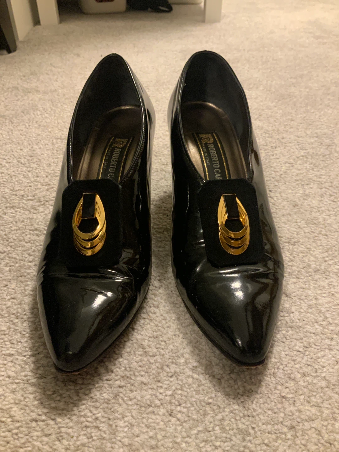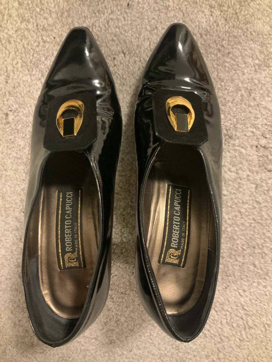 Selling a pair of Roberto Capucci black leather heels. They have a unique gold accent on the front. The shoes are in good condition and ready for a new owner!