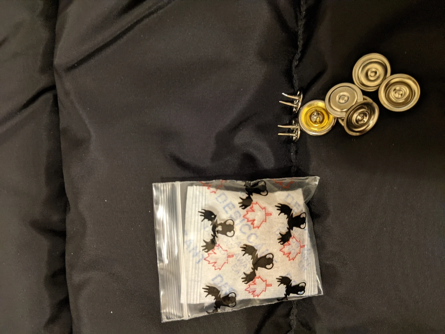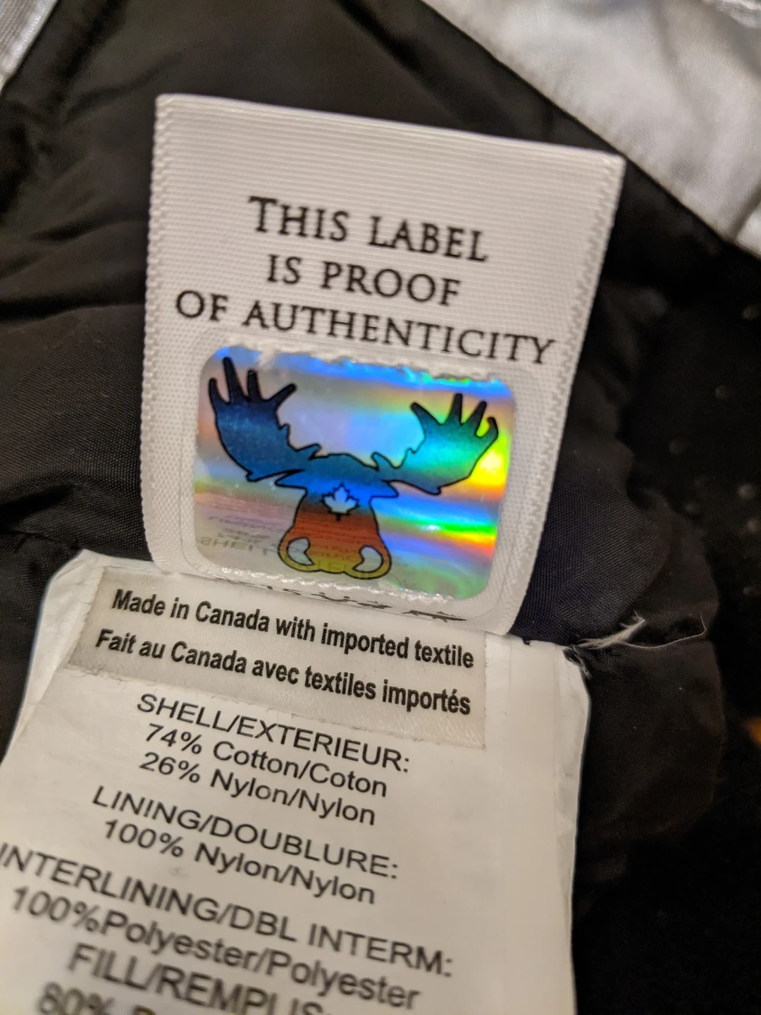 The shell is 74% cotton and 26% nylon, with a 100% nylon lining. It's made in Canada with imported textiles