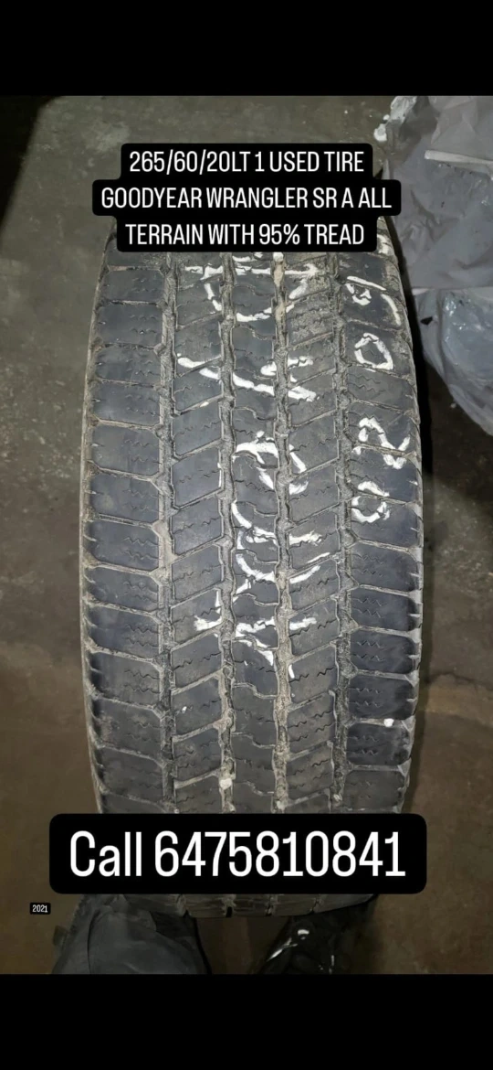 Selling a used Goodyear Wrangler SR A all-terrain tire. The size is 265/60/20LT and it has approximately 95% tread remaining.