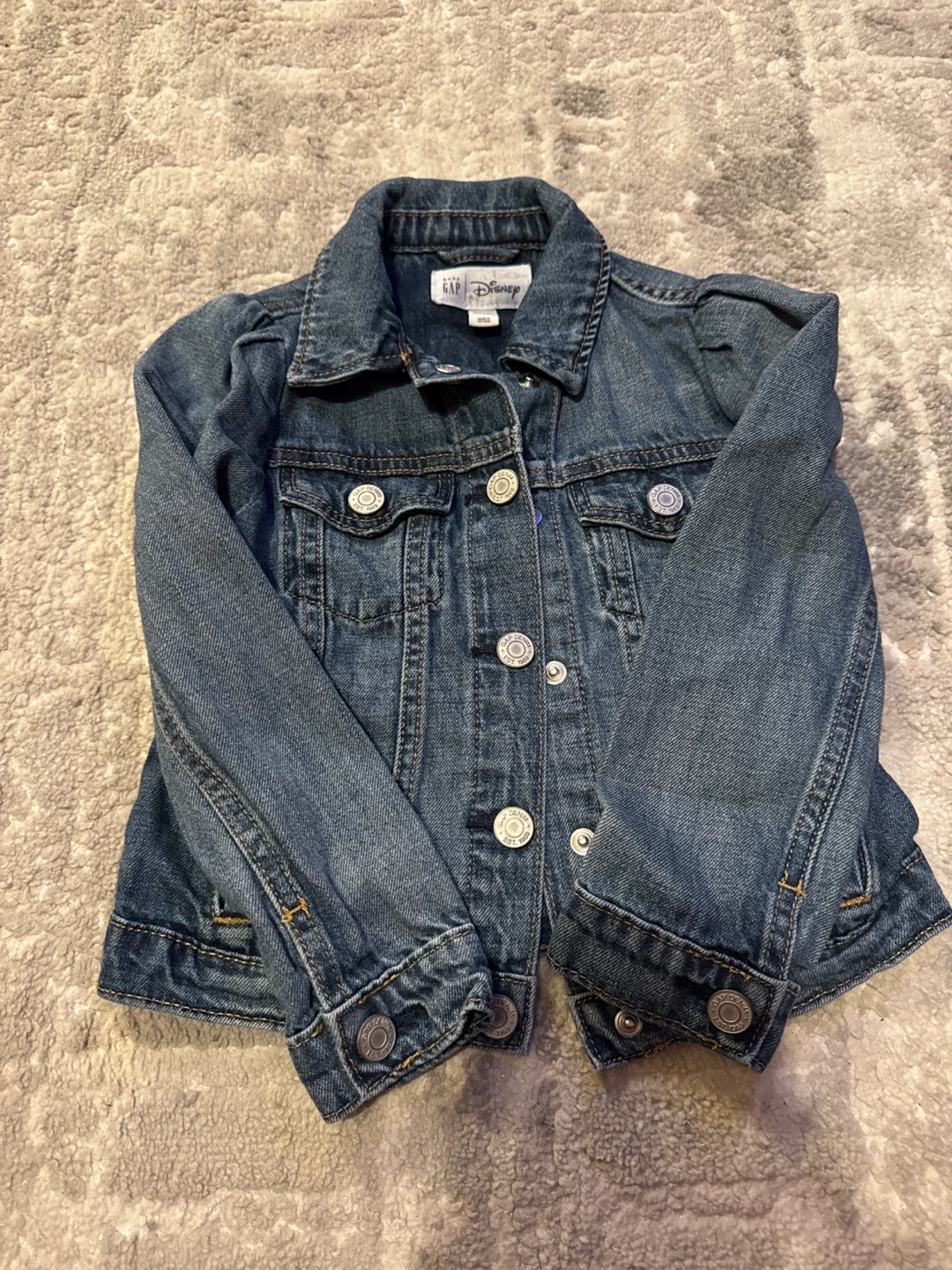 Check out this adorable GAP Disney denim jacket! It's a size 5T and features a cute Minnie Mouse design on the back. Perfect for your little one!