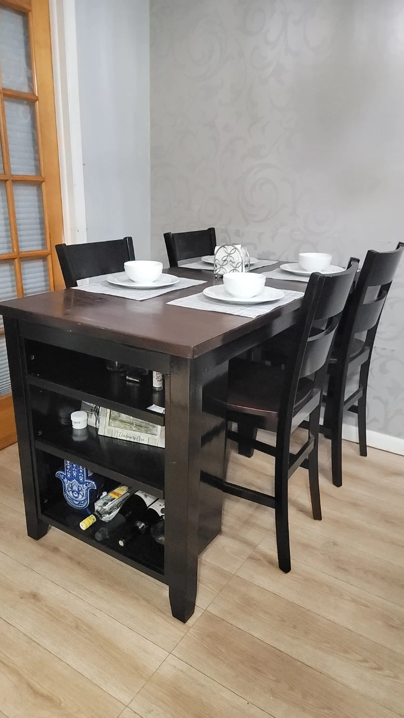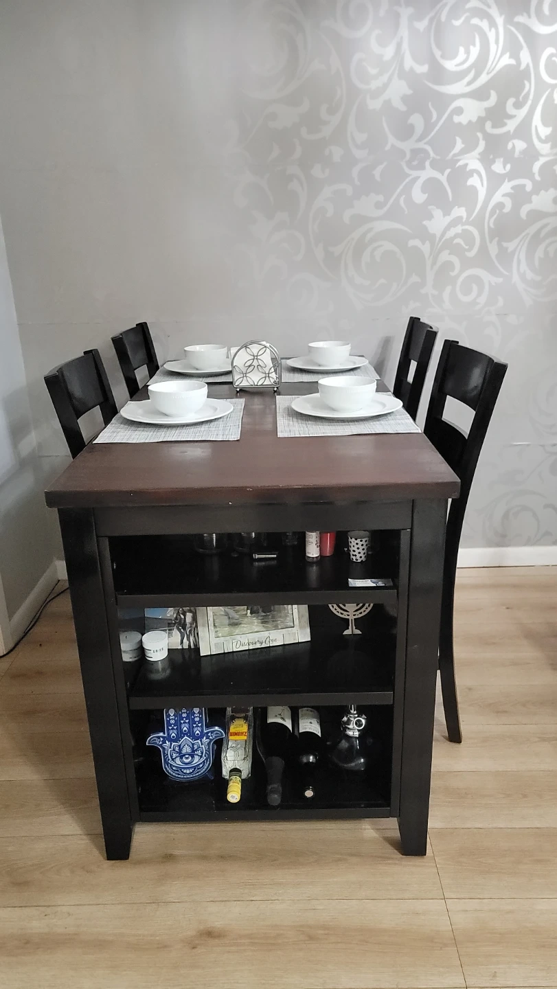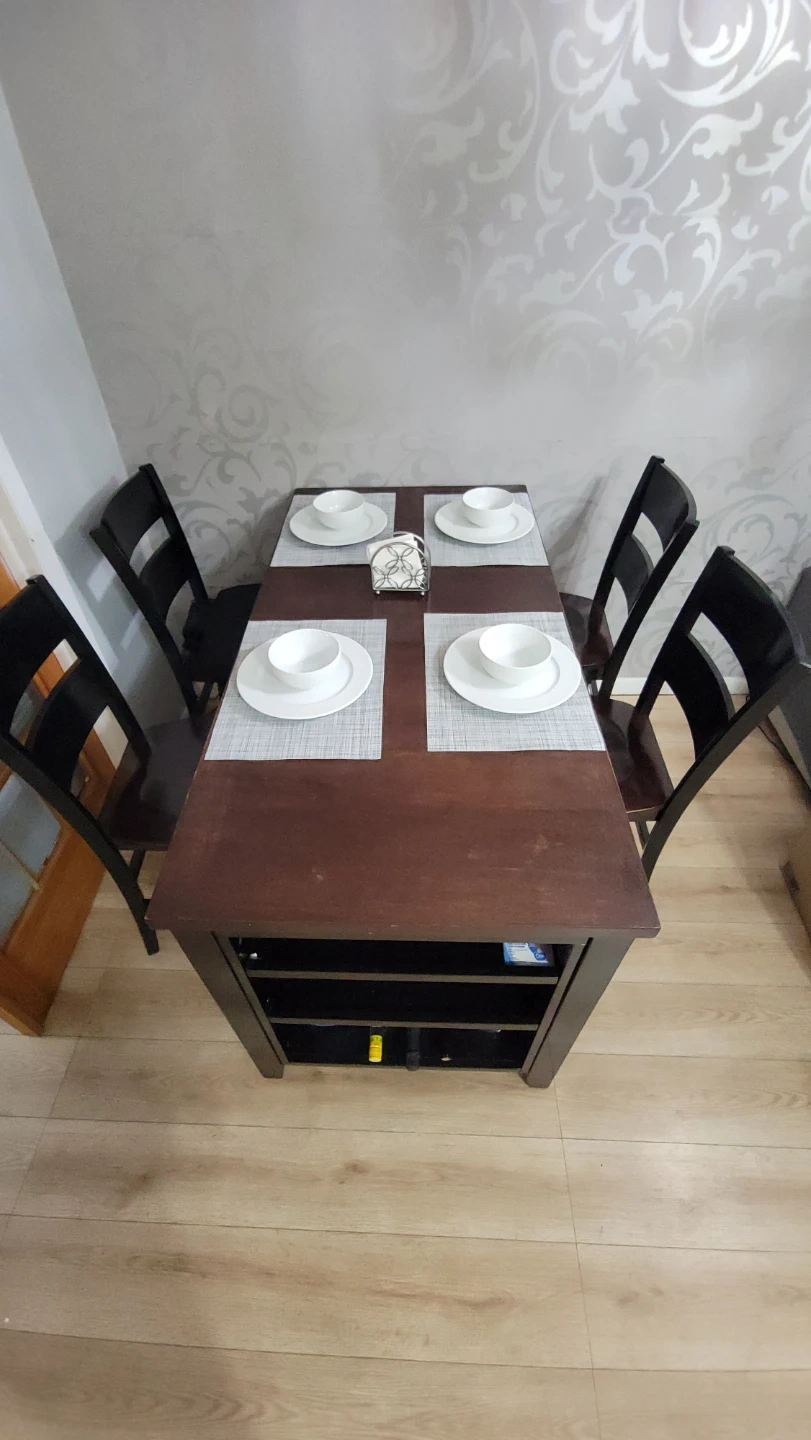 Selling a dining table with four chairs. The table has a dark brown top and black base with built-in shelving. The chairs are black. Great for a smaller dining area or kitchen!