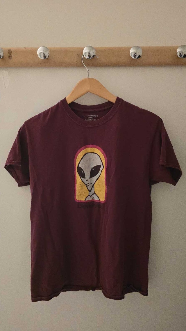 I am selling a variety of skateboard T-shirts and a jacket, with prices ranging from $5 to $50 depending on their condition and design. These shirts are perfect for skaters or anyone who loves the skater aesthetic. Most shirts are in good condition, ready to wear at the skate park or for casual outings. Represent your favorite skate brands and styles! If the ad is up, the item is available!