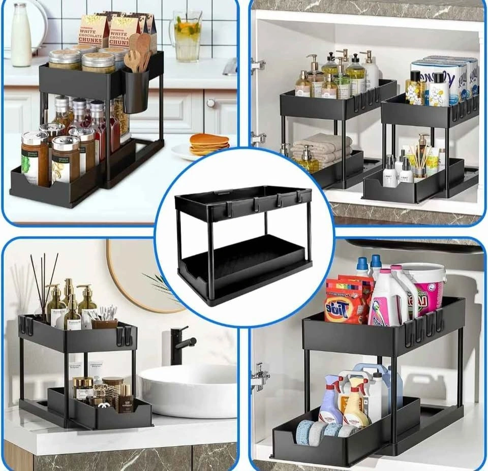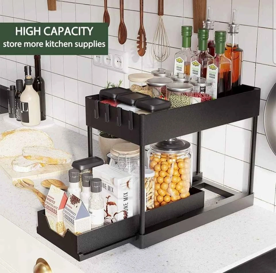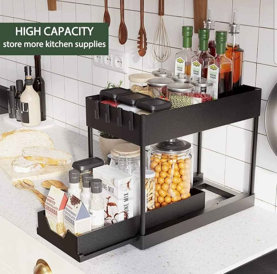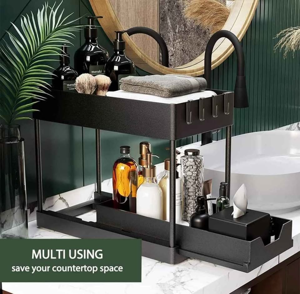 Black 2-tier storage organizer. Great for keeping bathroom or kitchen essentials organized. Has multiple compartments and hooks for storage. Sturdy and easy to assemble. Still in original packaging.