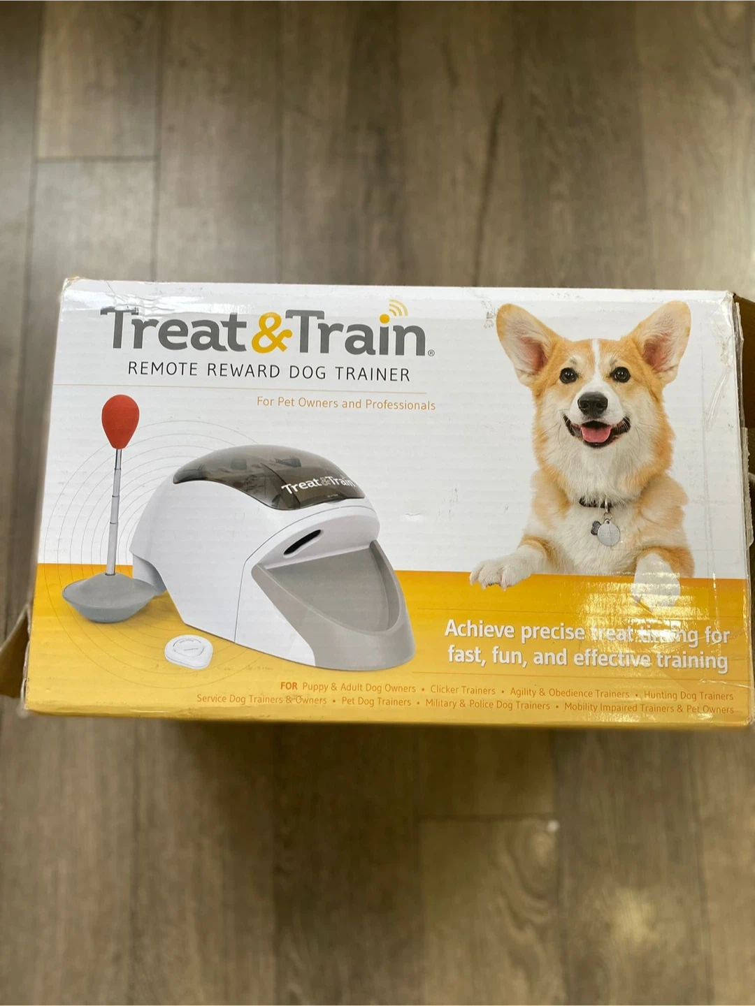 Treat & Train Remote Reward Dog Trainer for your furry friend! This is a great tool for training your dog with positive reinforcement. It includes the remote, base, and other accessories, all in the original box. Perfect for puppy and adult dog owners!