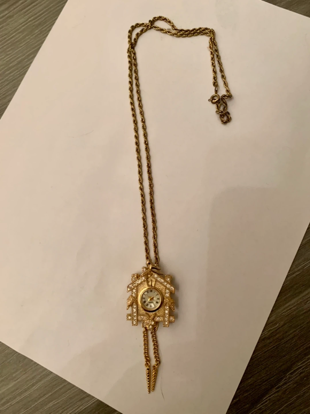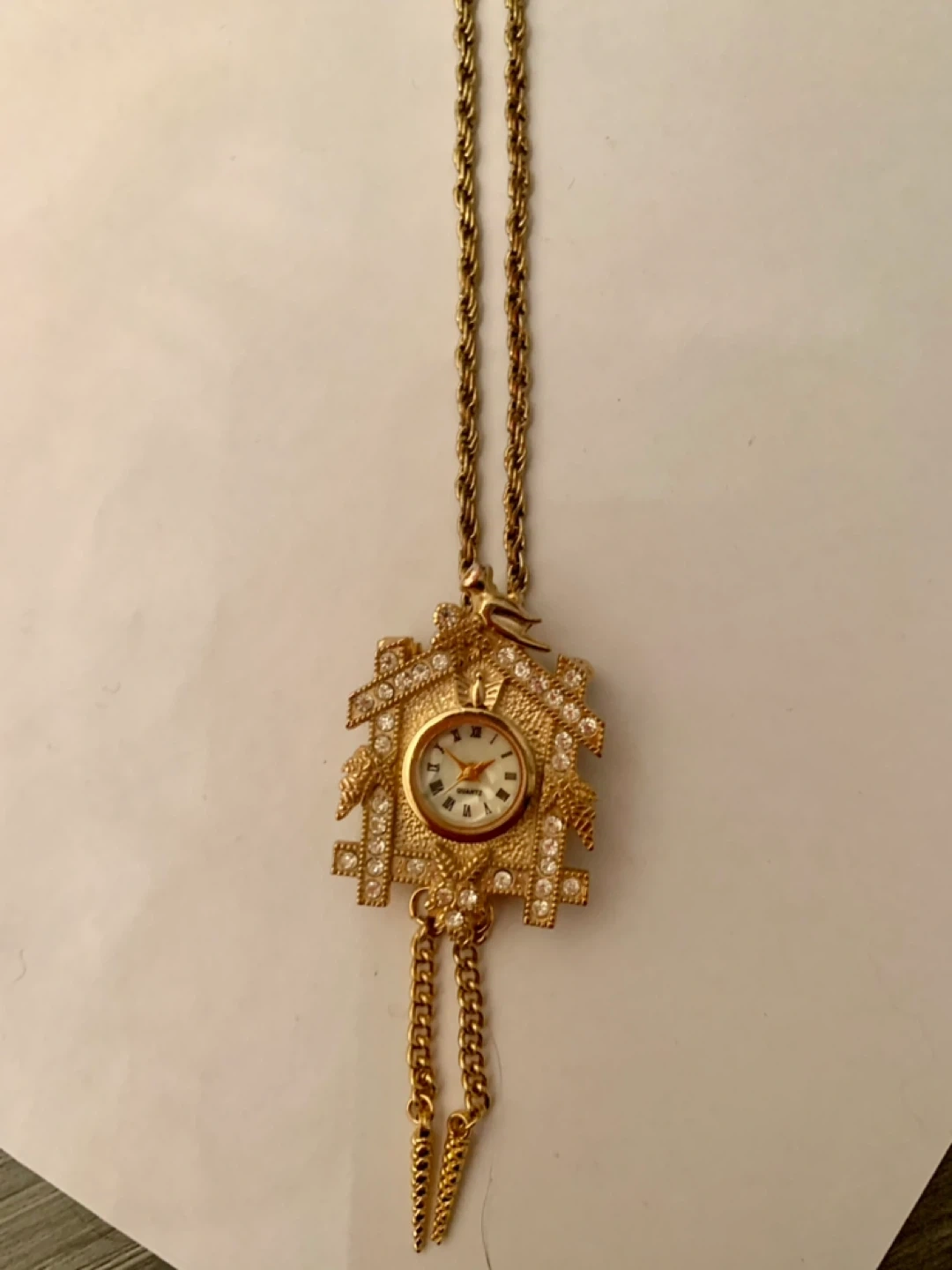 Selling a vintage cuckoo clock pendant necklace! It has a gold-tone finish and a unique design. The necklace measures approximately 16 inches in length. It's in great condition and would make a lovely addition to any jewelry collection. Needs a battery.