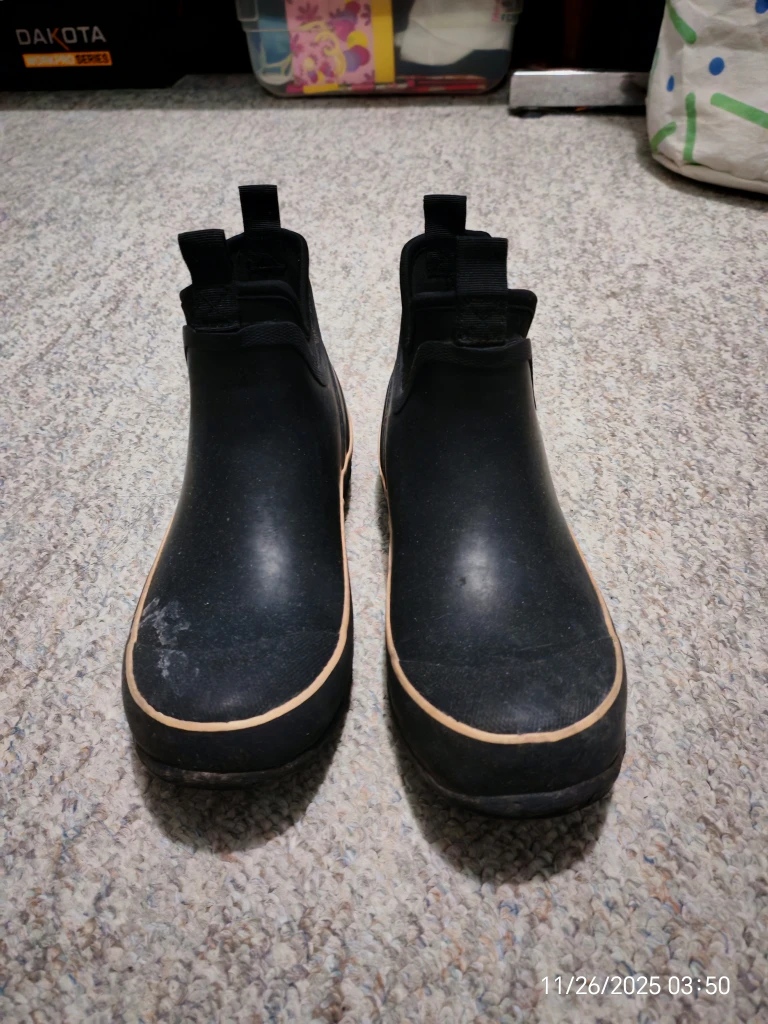 Selling a pair of WindRiver Dakota rubber boots in black. They show some signs of wear, but are still in good condition for outdoor use. Perfect for gardening or rainy days!