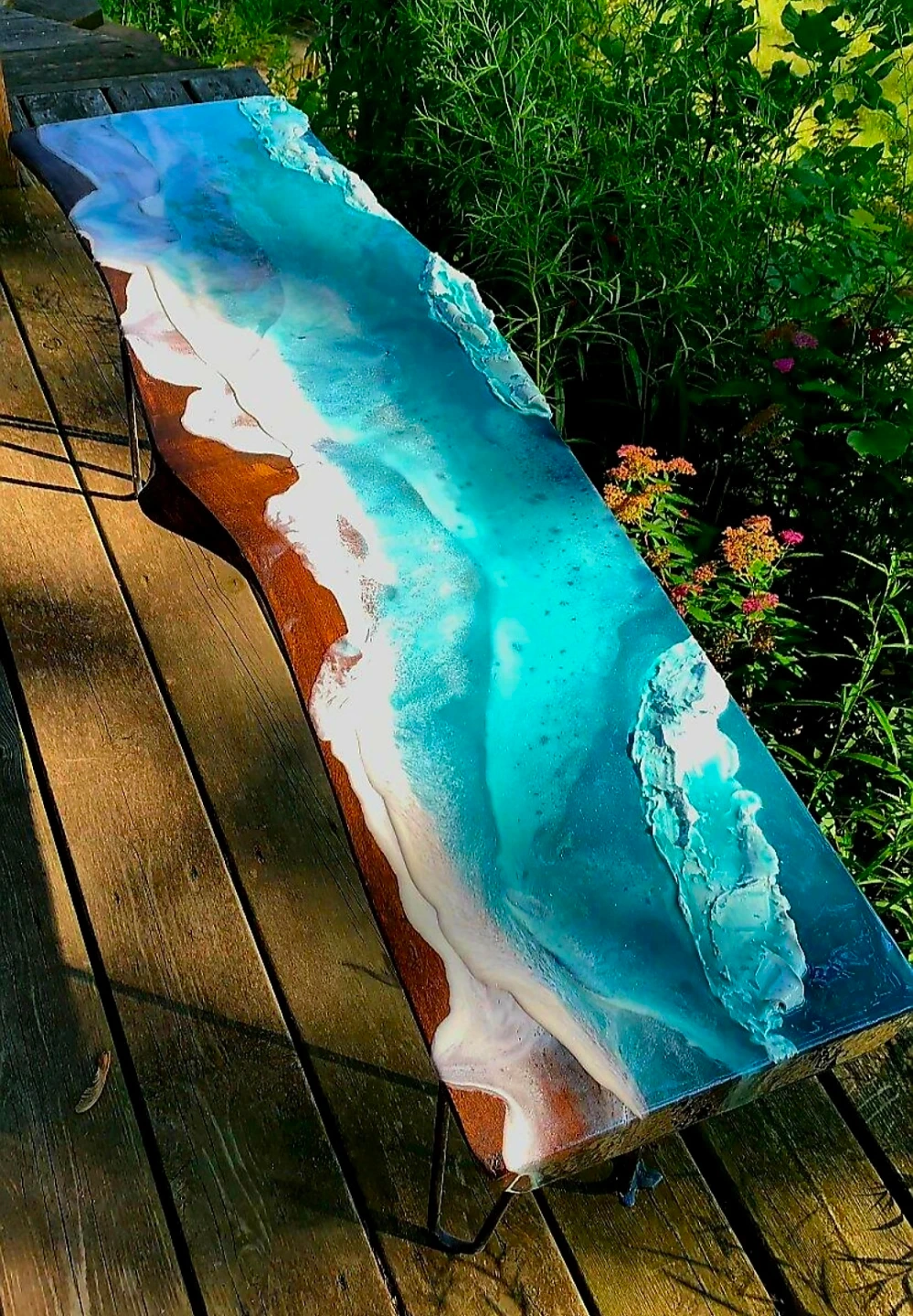 NOTE . table is not free it is just an example of what can be created . Beautiful resin river table with an ocean theme! The colours are so vibrant and it would look great in any home. It's a unique piece of furniture that's sure to be a conversation starter ... every piece is exclusive to you and custom to order prices vary