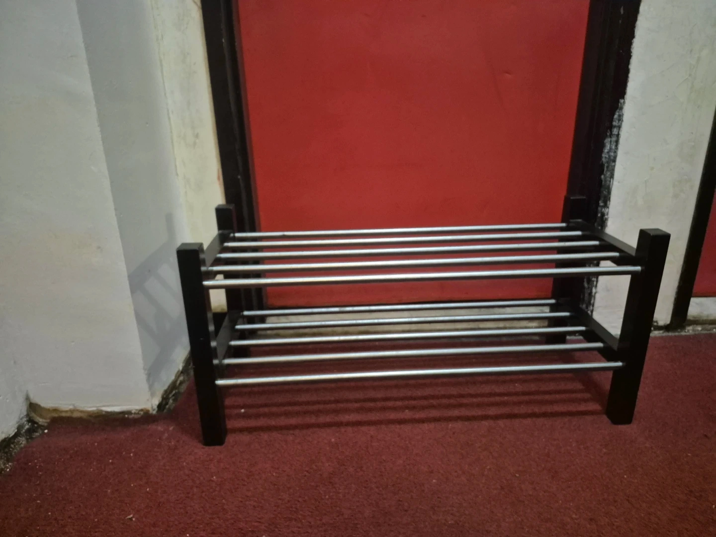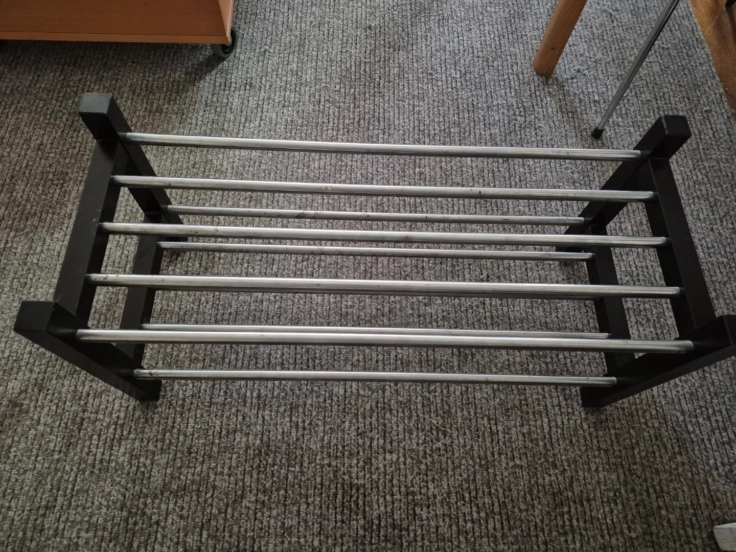 This is a 2 shelf rack with a black frame and silver bars. It's in excellent condition and ready to hold your favorite shoes.