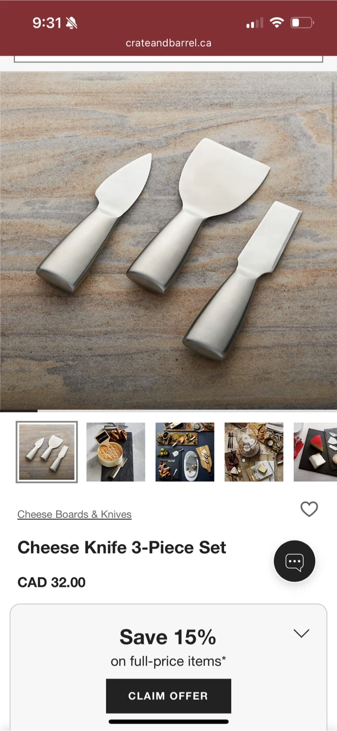 Selling a brand new Crate & Barrel cheese knife set, still in its original box! This set includes three different knives perfect for serving a variety of cheeses. Originally bought for $32, it's a stylish and functional addition to any kitchen or a thoughtful gift for cheese lovers.