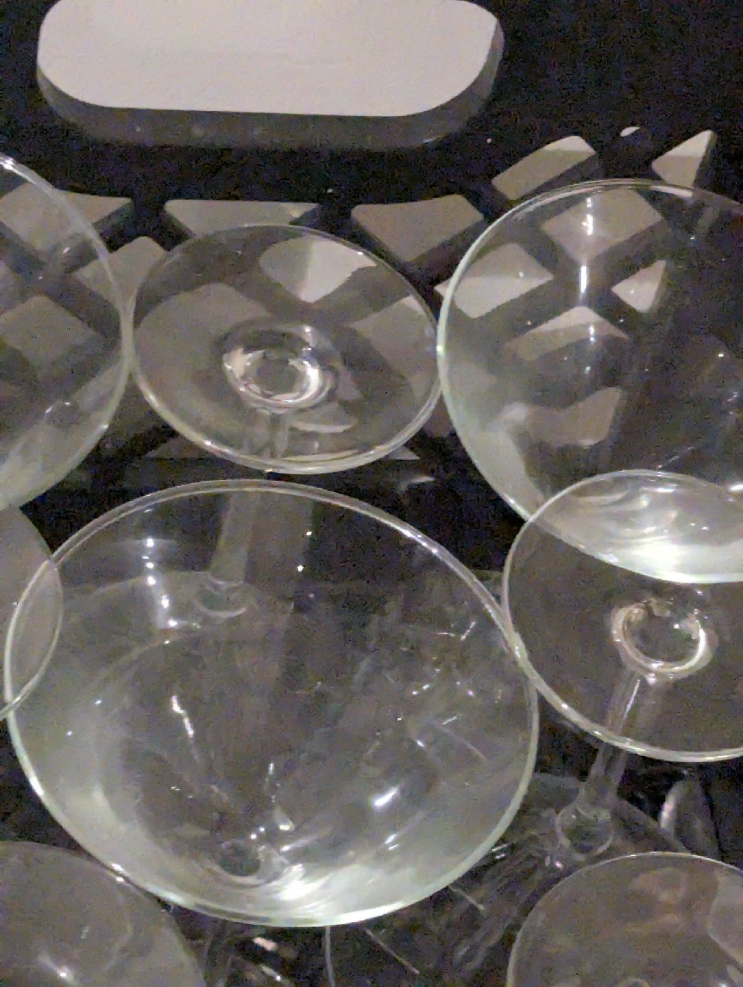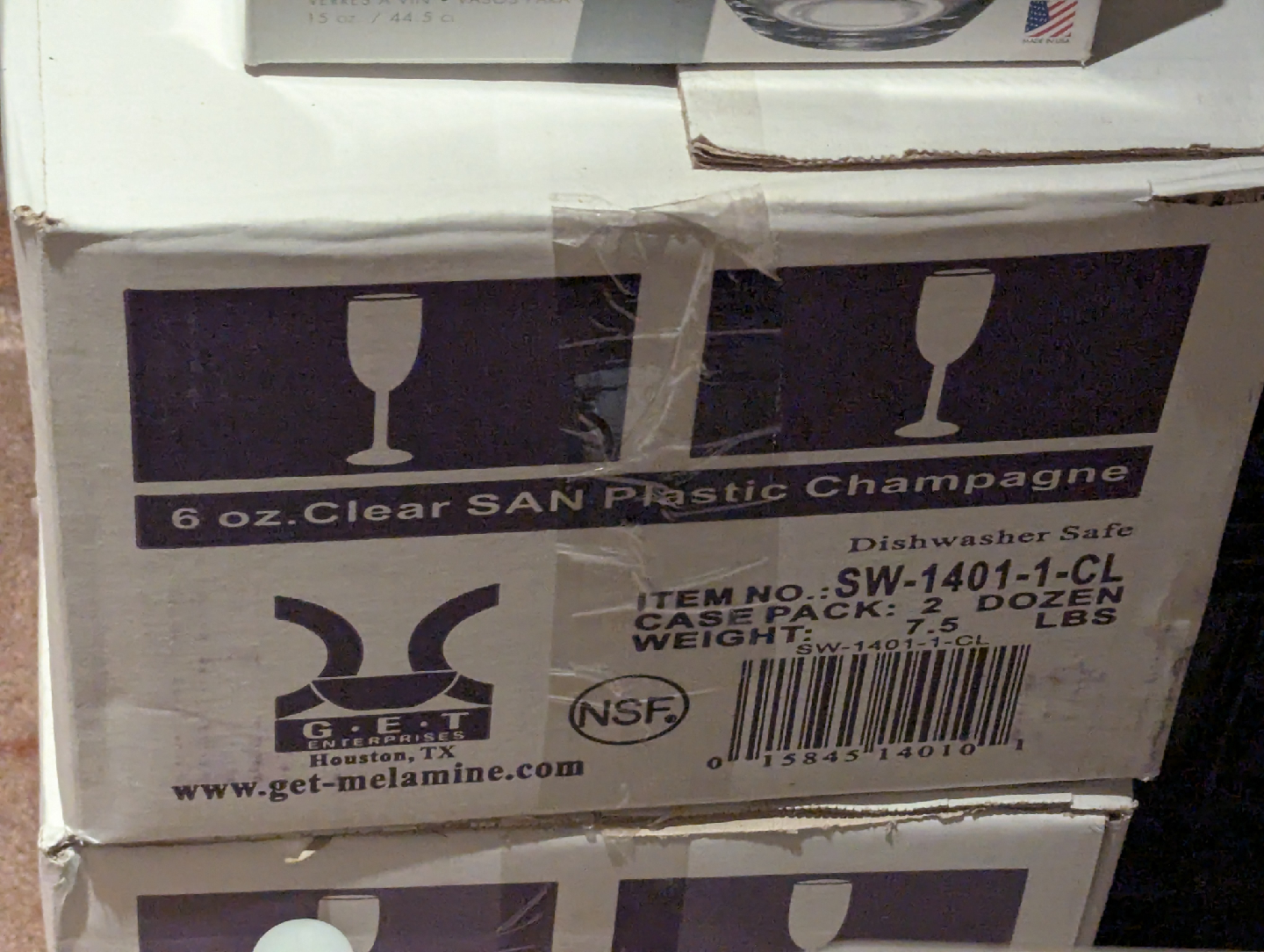 Selling a set of G.E.T. 6 oz clear SAN plastic champagne glasses. They are dishwasher safe and come in a case pack of 2 dozen. Great for parties or events as well as various types of drinking glasses, incl stemless wine glasses, martini glasses, glass champagne flutes.